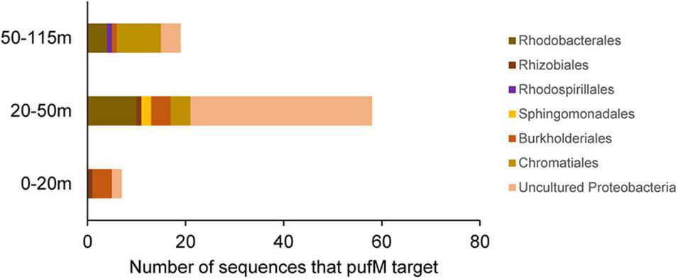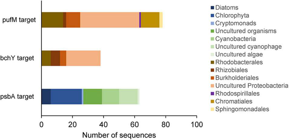 The pufM, bchY and psbA genes were amplified by PCR from environmental DNA samples. The pufM gene was targeted using the primer set pufM-557F and pufM-750R (forward: CGCACCTGGACTGGAC, reverse: CCATGGTCCAGCGCCAGAA), generating a product length of 229 bp (Ahn et al., 2014). The bchY primer set was bchY-F and bchY-R (forward: CCNCARACNATGTGYCCNGCNTTYGG, reverse: GGRTCNRCNGGRAANATYTCNCC), generating a product length of 510 bp (Yutin et al., 2009). The psbA gene was amplified with the primer set psbA-F and psbA-R (forward: GTITTYCARGCIGARCAYAAYATIYTIATGCAYCC, reverse: CCRTTIARRTTRAAIGCCATIGT), resulting in a product length of 344 bp (Kong et al., 2014). The PCR conditions are given in Supplementary Table 1. Each PCR reaction mixture contained 0.25 μl Taq-Polymerase (5 U μl–1), 1μl of each primer (20 pmol μl–1), 5μl dNTPs (2 mM), 5 μl Taq-buffer (10x) and 5 μl MgCl2 (25 mM), 1 μl DNA template, 1 μl BSA and distilled water in a final volume of 50 μl. All PCR products were purified using the E.Z.N.A. gel extraction kit (Omega Bio-Tek, Inc., United States), and then Topo TA cloned (Invitrogen, Life Technologies Grand Islands, NY, United States) Sanger Sequencing was carried out at the Institute for Clinical Molecular Biology (IKMB), University of Kiel (Germany). Trimmed and quality checked nucleotide sequences were aligned with closest references, and maximum likelihood trees were generated using the MEGA-X software (v 10.1.7) with the ClustalW alignment algorithm (Kumar et al., 2018) (Tamura-Nei Model, 500 bootstraps). Clone sequences generated in our study were submitted to the National Center for Biotechnology Information GenBank database and assigned accession numbers (MZ960574 to MZ960756).