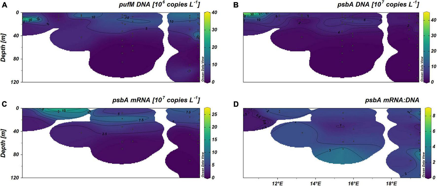To address this topic, we studied the spatial pattern of bacterial diversity and abundance in the Baltic Sea, with a specific focus on AP and OP (without eukaryotic algae), using 16S rRNA amplicon sequencing. An oxygen minimum zone (OMZ) was included in our sampling strategy. We also used qPCR targeting specific marker genes of AP and OP (including eukaryotic algae) to detect and compare their diversity and distribution. The most common used marker genes, pufM and bchY, were used for targeting AP. The psbA gene was used for targeting OP. We further used gene expression profiles of psbA and pufM genes (Sharon et al., 2007; Kong et al., 2014; Alcamán-Arias et al., 2018; Fecskeová et al., 2019), as well as carbon fixation rates to understand photosynthesis activity in the different basins of the Baltic Sea. Here, we investigate the spatial pattern of expression of psbA and pufM and compare their roles in different Baltic Sea environments to extend the understanding of how the role of those different groups of phototrophic groups in a changing ocean.