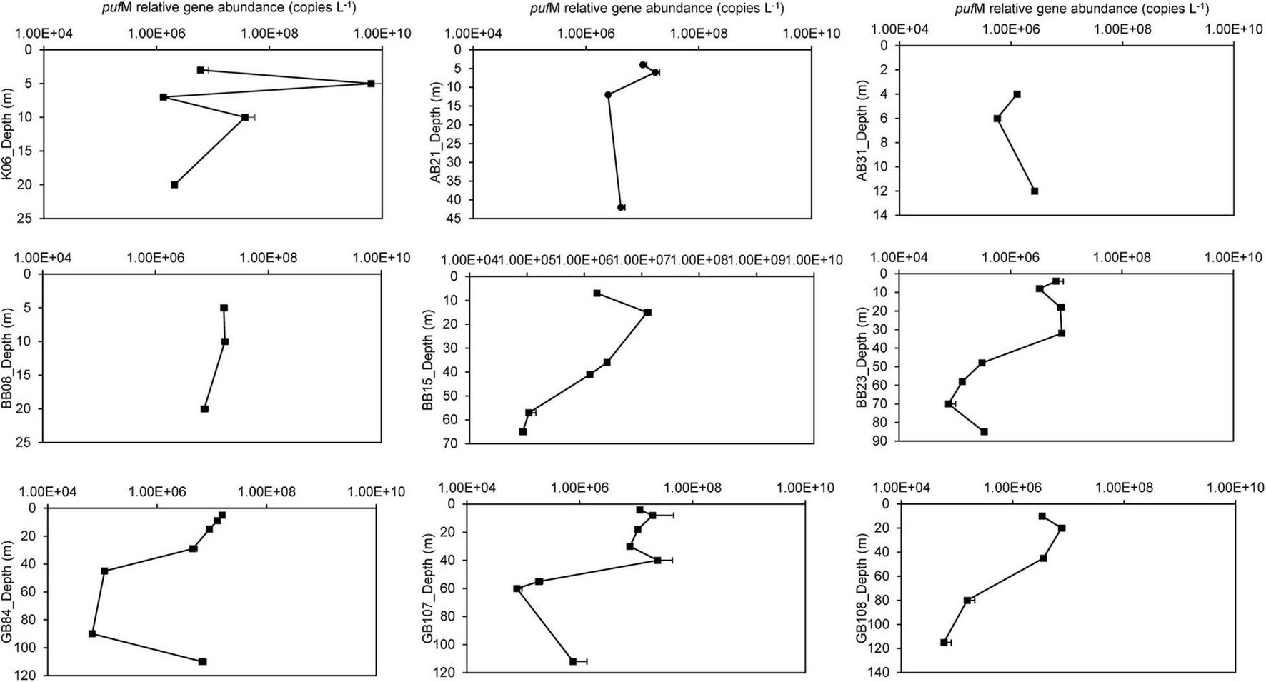| Measurement | pufM gene (copies L–1) n = 49 | psbA gene (copies L–1) n = 49 | psbA transcript (copies L–1) n = 23 | psbA transcriptional activity n = 23 | OP abundance in microbial community (%), n = 16 | AP abundance in microbial community (%), n = 16 |