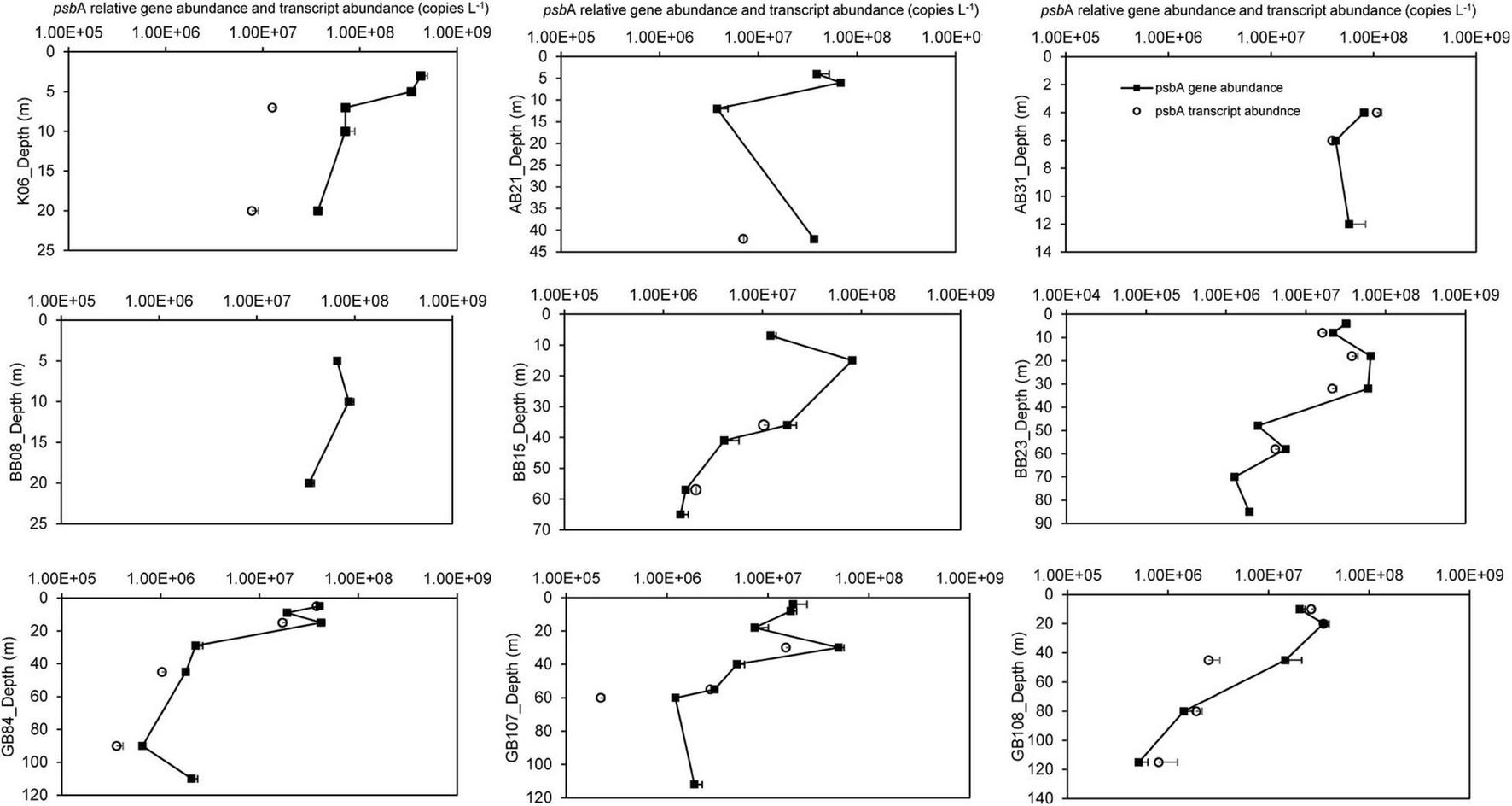 | psbA transcript (copies L–1) n = 23 | – | r = 0.727 | – | – | – | – |