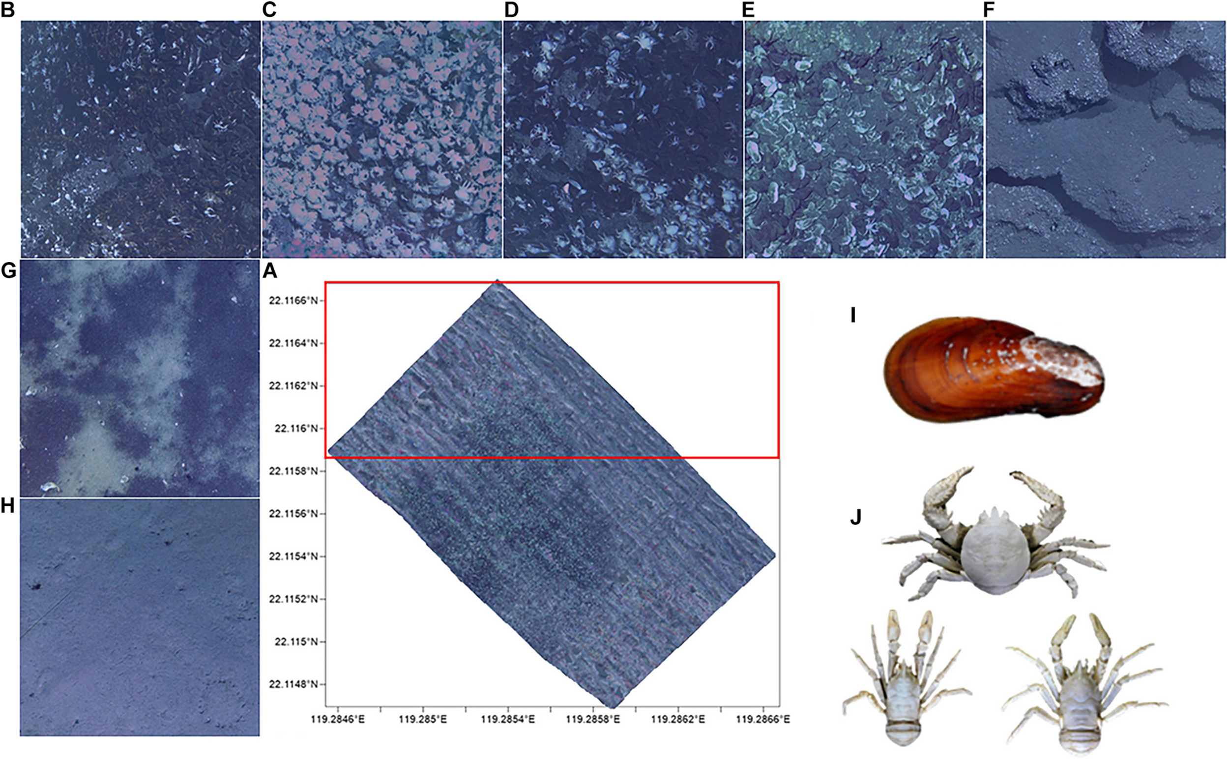 (A) Mosaic (20,000 m2) of Formosa ridge cold seep from 2016. The outline represents the area where images were obtained and the red frame is the training set. The hard substrates are: (B) mussel beds, (C) lobster clusters, (D) biological mixing, (E) shell debris, and (F) exposed authigenic carbonates. The soft substrates are the (G) reduced sediments and (H) muddy bottom. The dominant species in cold seep are (I)Gigantidas platifrons and (J) Munidopsidae.