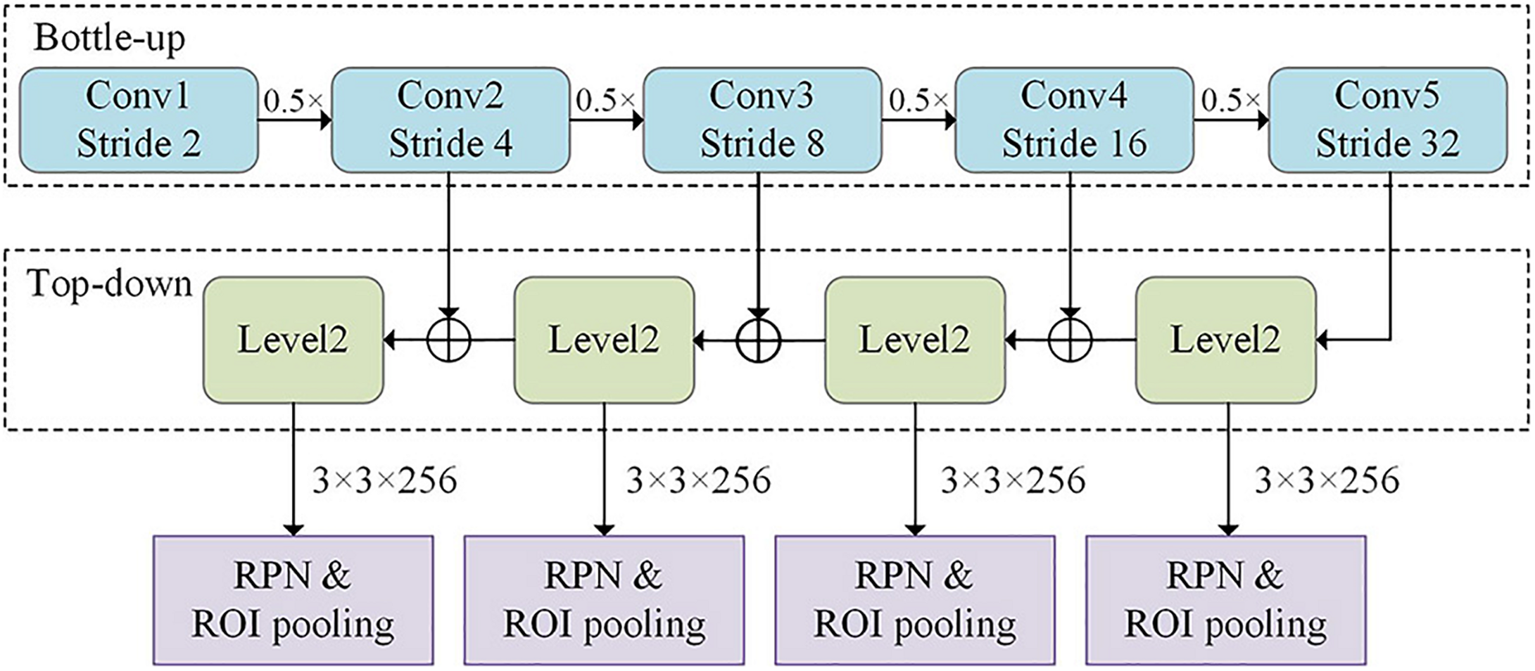 Structure of the feature pyramid network (FPN) algorithm. Top-down structure was designed in the FPN structure while the lateral connections fused the shallow feature map.