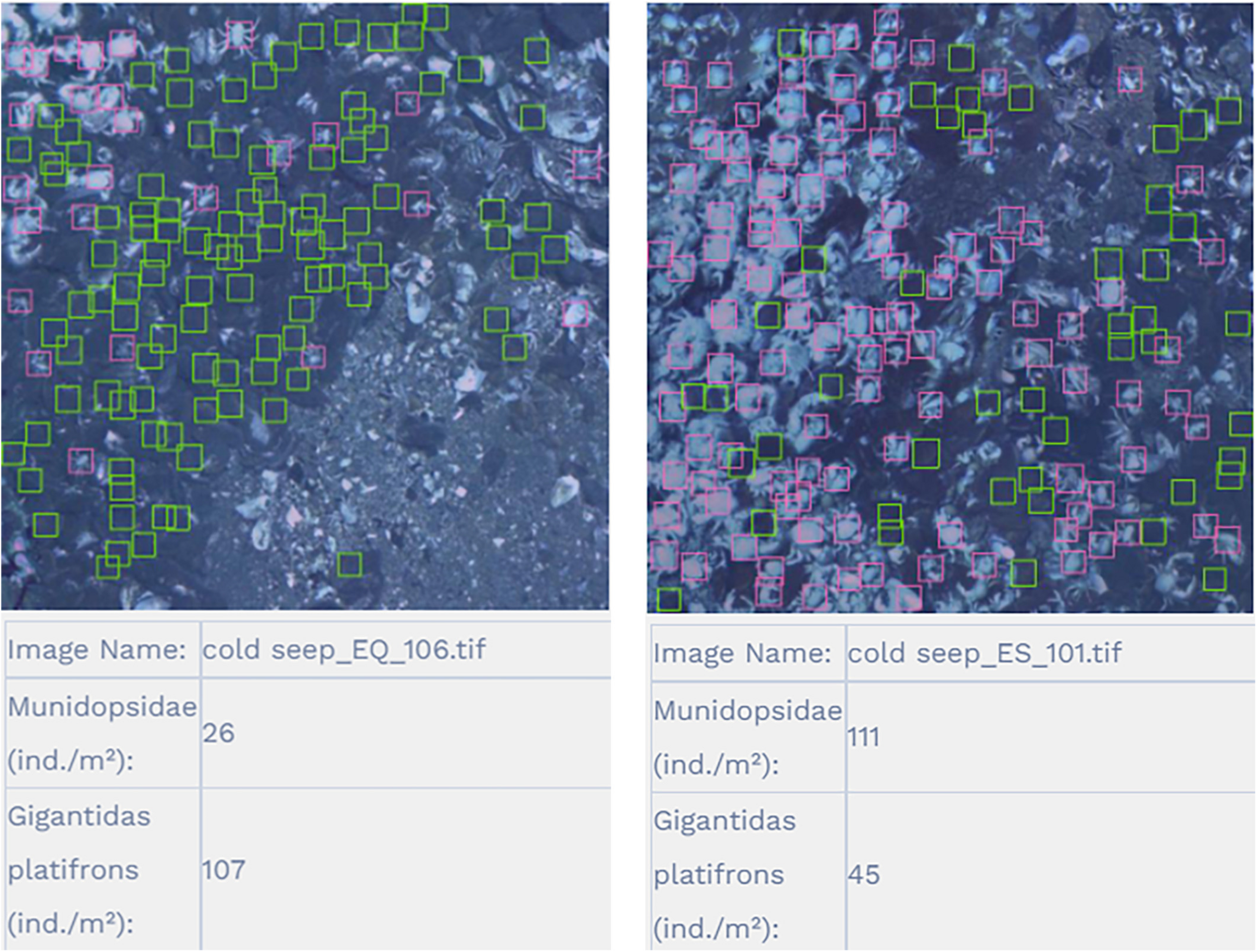 Recognition results for G. platifrons and Munidopsidae as represented as green and pink frames, respectively.
