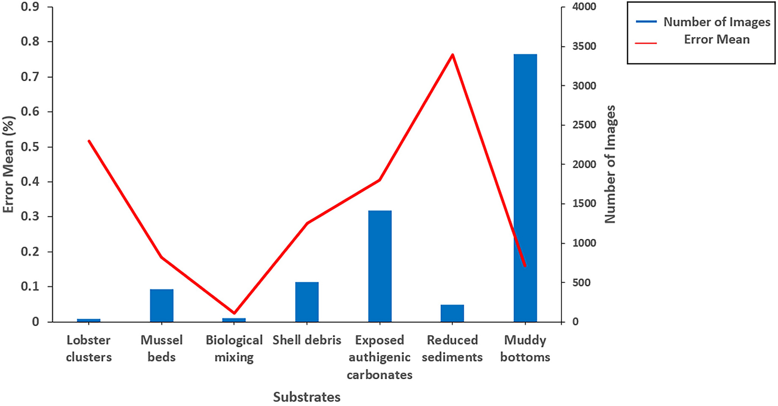 A total of 6,000 images randomly selected from the remaining parts of the Mosaic were used to test the error in the model. The error mean for epifauna was calculated as: