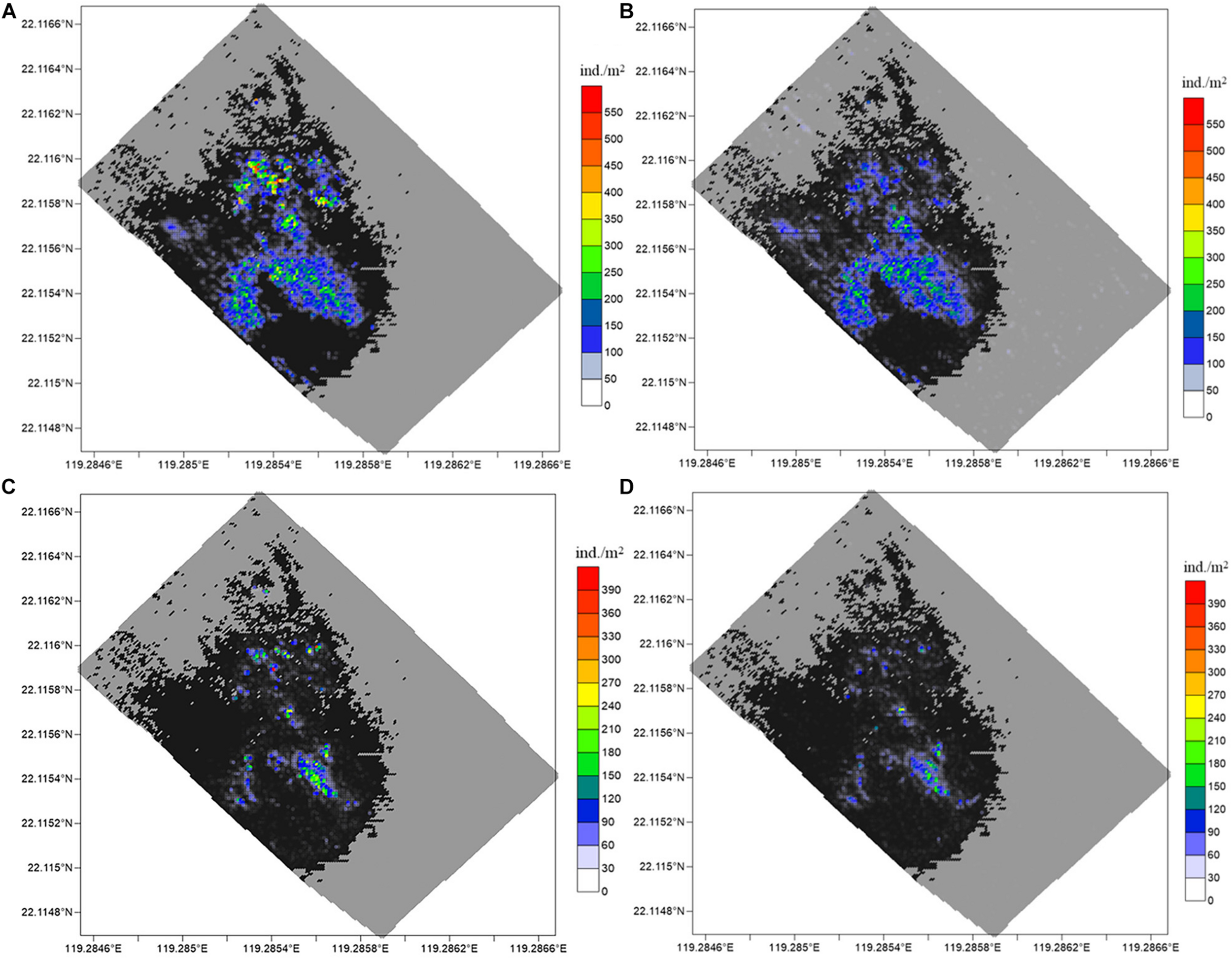 | Lobster clusters (C) | Large number (>50 ind./m2) of Munidopsidae and small number (<20 ind./m2) of G. platifrons | |