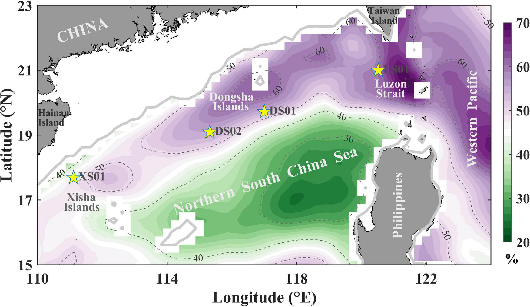 The ratio of standard deviation (STD) of 10–110-day band-passed SLA to that of the raw SLA (i.e., STD of 10–110-day SLA/STD of raw SLA) is shown in Figure 1, demonstrating the contribution of ISV to the total variability. The ISV dominated the variability of SLA in the Luzon Strait and along the northern slope (Figure 1). It accounted for 25–70% (with an average value of ∼49%) of the total variability in the NSCS. In particular, ISV explained more than 50% of the total variability on the slope and ∼70% in the Luzon Strait. ISV weakened westward from the Luzon Strait to Xisha Islands.