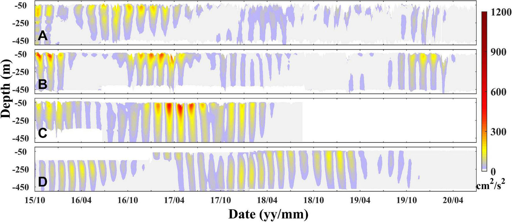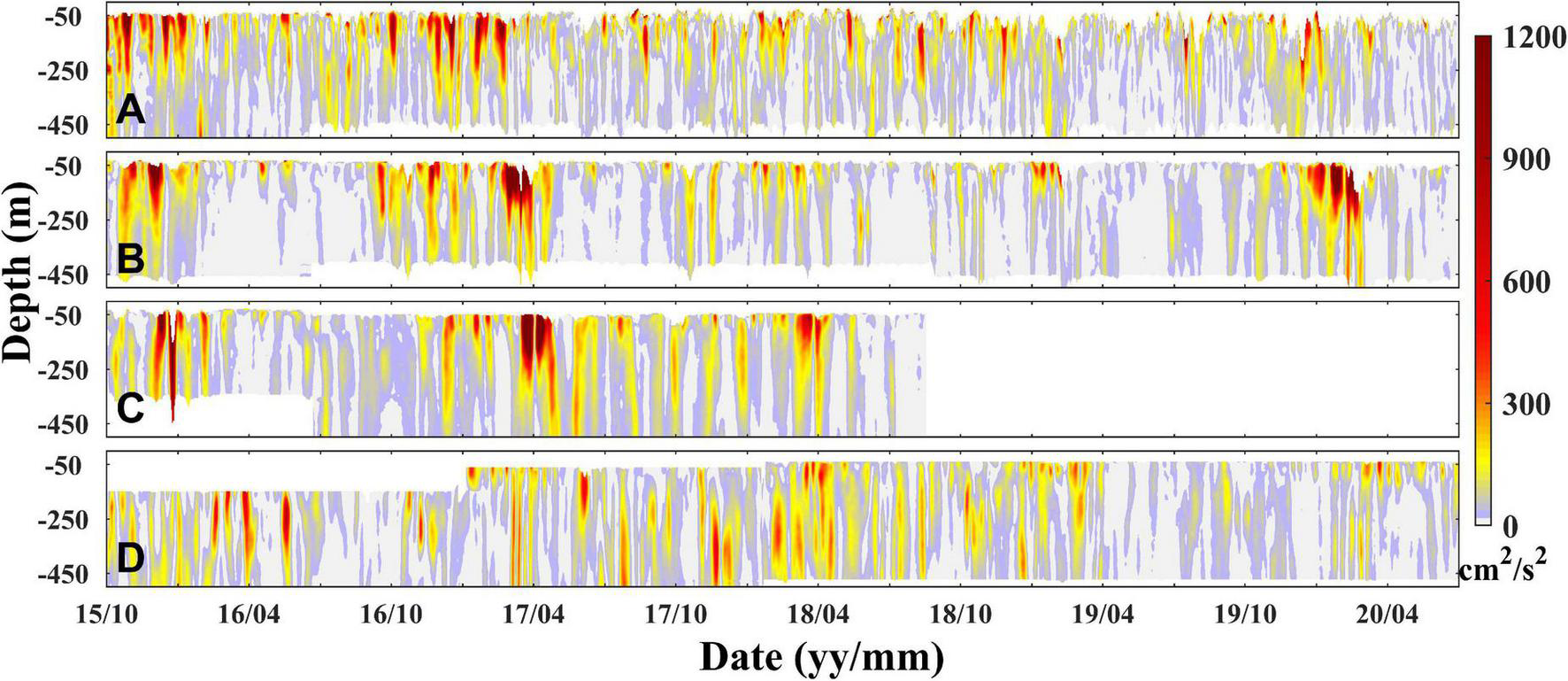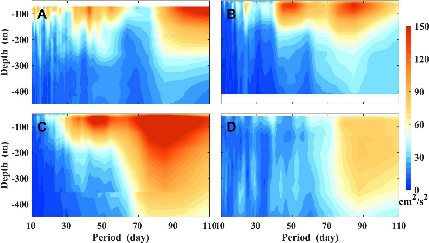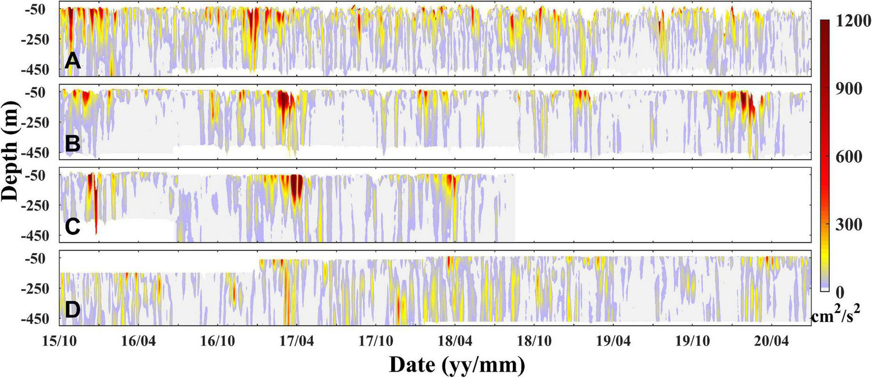 We calculated the kinetic energy spectra in the variance-preserving form using the ADCP-observed velocity in each layer at the four mooring sites to examine the dominant frequency bands of the variability of the current (Figure 4). Notably, at DS02, the velocity between 350 and 450 m was only observed from July 2016 to August 2018 (Figure 2C), resulting in a break in the spectra at ∼350 m (Figure 4C). At XS01, there was no observation in the upper 150 m before January 2017 (Figure 2D). Thus, only data from January 2017 to July 2020 were used to calculate the spectrum.