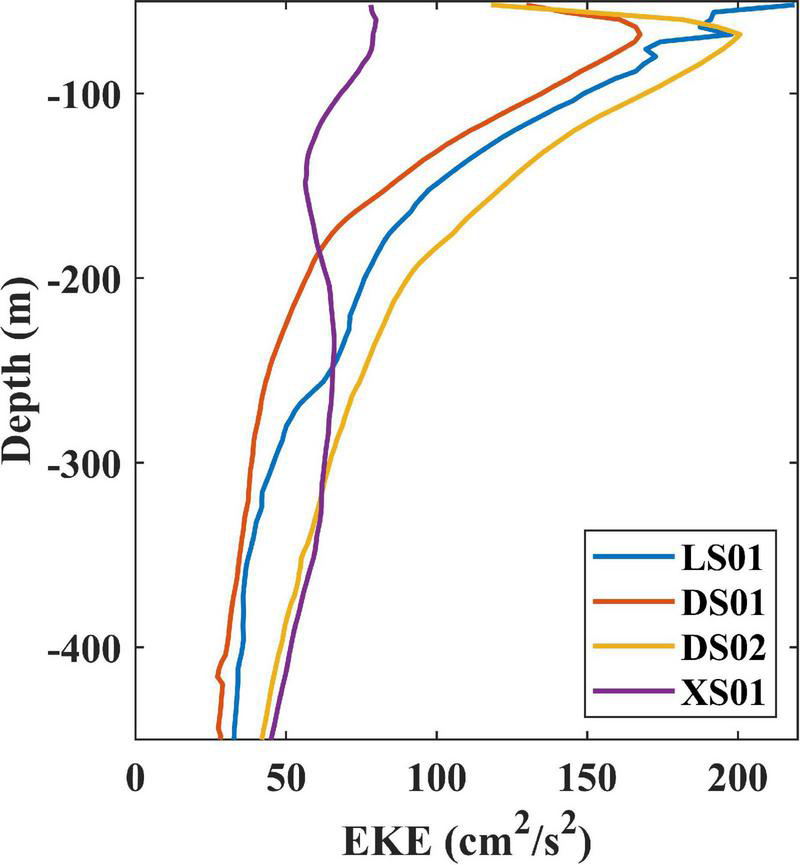The time-averaged EKE profiles at the four mooring sites are shown in Figure 3. EKEs exhibited a maximum value in the subsurface of ∼70 m at DS01 and DS02. The subsurface maximum EKE was consistent with the previous study of Wang et al. (2020a), who reported a subsurface (40–70 m) speed maximum existed in the NSCS, and it originated from the Kuroshio intrusion. The EKE decreased rapidly with depth at LS01, as did DS01 and DS02 below 70 m depth. However, the EKE was vertically aligned at XS01, with the vertical difference less than 40 cm2/s2. In the upper 150 m, EKE at LS01, DS01, and DS02 was much greater than that at XS01, whereas it showed a slight difference below 200 m. EKE at XS01 even became the strongest below 320 m, significantly stronger than that at LS01 and DS01. The time- and vertical-averaged EKE was 77.3, 64.1, 91.6, and 61.2 cm2/s2 at LS01, DS01, DS02, and XS01, respectively. The strongest ISV was observed at DS02, and the weakest ISV was observed at XS01. The relatively weak ISV at XS01 was possibly due to that Xisha Islands are located at the dissipation area of most mesoscale eddies in the NSCS (Chen et al., 2011; He et al., 2018).