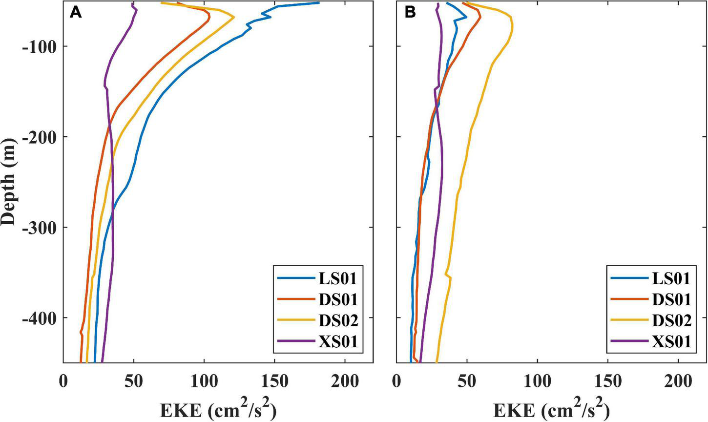 The time-averaged EKE profiles with periods 10–65 days and 65–110 days are shown in Figure 7. Both the high- and low-frequency EKE exhibited a subsurface maximum characteristic at DS01 and DS02, with an additional occurrence at LS01 for the low-frequency (Figure 7). The high-frequency EKE decreased quickly below 70 m at LS01, DS01, and DS02 (Figure 7A). However, the vertical distribution of EKE showed that the low-frequency ISV had less variations with depth at the four mooring sites (Figure 7B). The high-frequency EKE weakened westward from LS01 to XS01 (Figure 7A), with mean values of 56.5, 36.3, 44.5, and 34.7 cm2/s2 at LS01, DS01, DS02, and XS01, respectively (Table 2). However, the low-frequency EKE was strongest at DS02 with the mean value of 49.4 cm2/s2 and weakest at LS01 with the mean value of 22.5 cm2/s2 (Figure 7 and Table 2). Thus, the ISV was strongest at DS02 (with a time- and vertical-averaged EKE of 91.6 cm2/s2) among the four mooring sites (Figure 3 and Table 2).