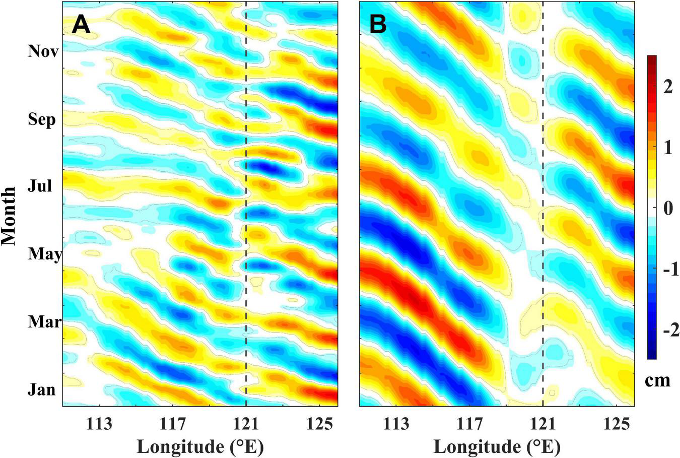 Hovmöller diagrams of annual mean sea level anomaly (cm) of two periods along with the black box of Figure 8. (A) 10–65-day period; (B) 65–110-day period. Black dashed lines: central Luzon Strait.