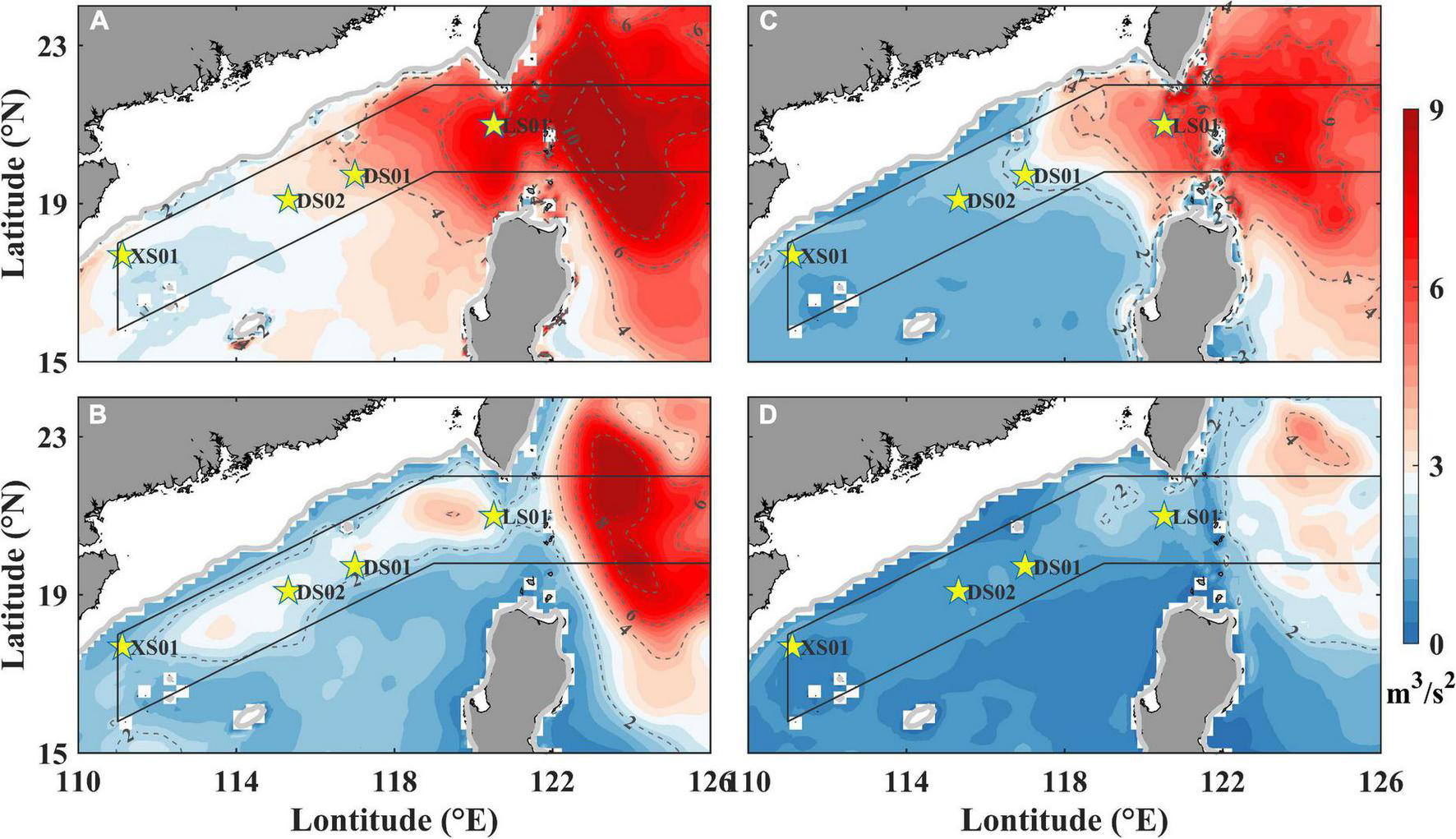 Horizontal distribution of vertical integrated energy. (A) Eddy potential energy (EPE) in 10–65-day period (m3/s2); (B) EPE in 65–110-day period (m3/s2); (C) Eddy kinetic energy (EKE) in 10–65-day period (m3/s2); and (D) EKE in 65–110-day period (m3/s2) averaged from January 2003 to December 2012.