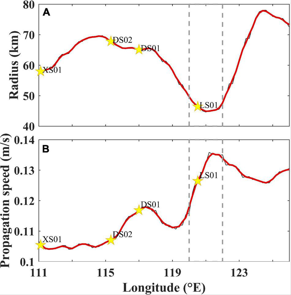 (A) Mean eddy radius (km) and (B) mean eddy propagation speed (m/s) along with the black box of Figure 8. Thin black lines: raw data; thick red lines: running means of raw data; mooring stations (yellow stars) are marked on lines according to longitudes; gray dashed boxes: Luzon Strait.