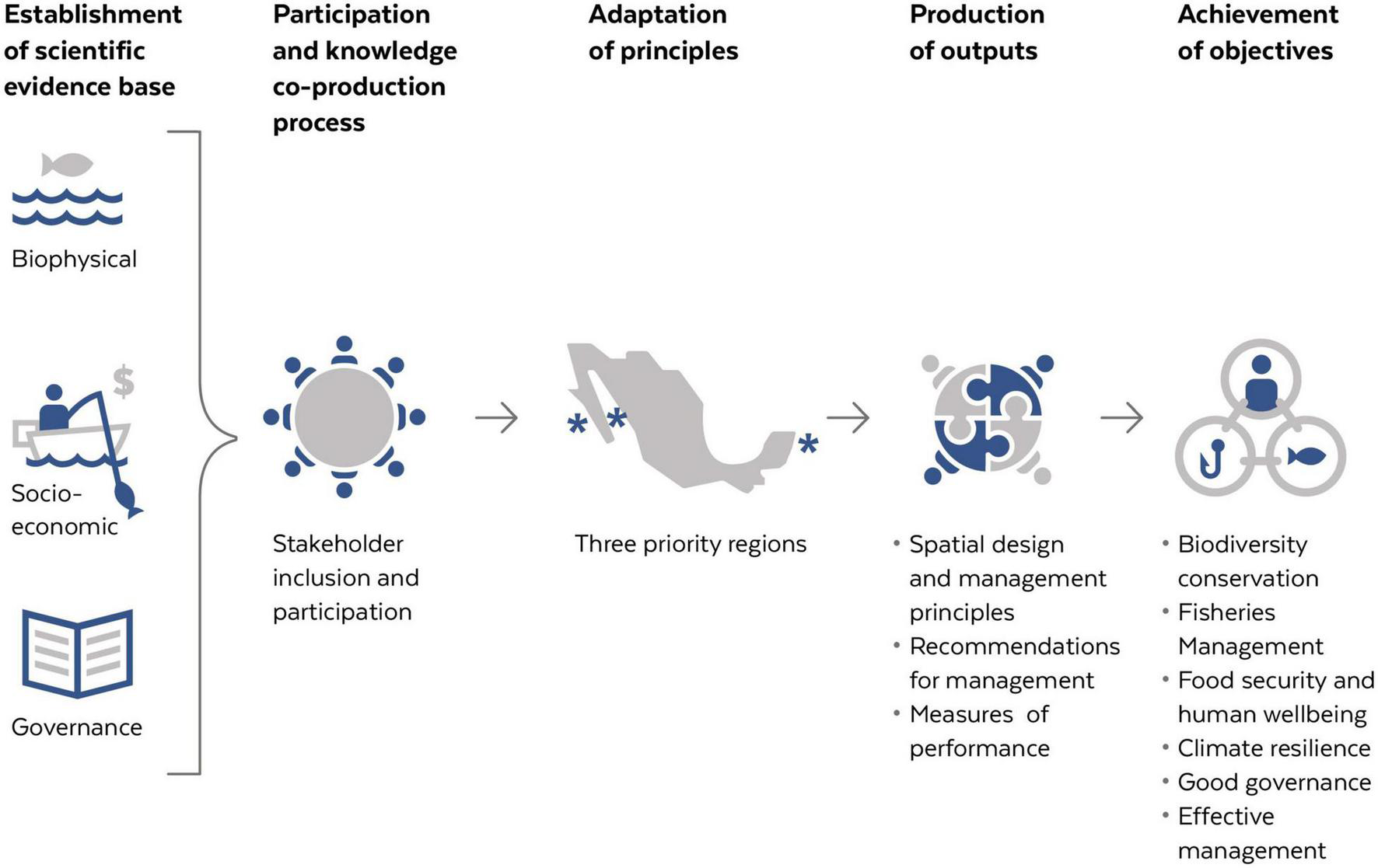 Conceptual diagram of the general vision for development of biophysical, socio-economic and governance principles for marine reserve design and management in three priority regions in Mexico: Pacific of the Baja California Peninsula, Gulf of California and Mexican Caribbean.