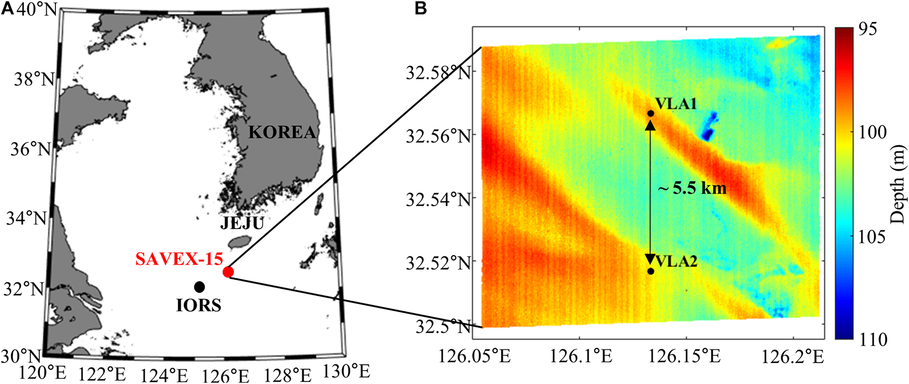 (A) Location of the experimental site (red circle) of SAVEX-15. The black dot denotes the IEODO ocean research station (IORS). (B) Topographic map of the experimental site including two vertical line arrays (VLAs) separated by 5.5 km: VLA1 and VLA2.