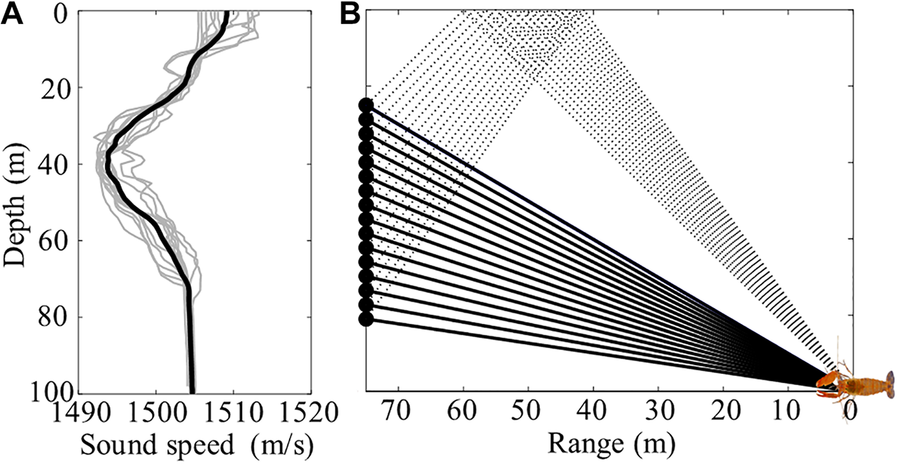 (A) Sound speed profiles measured by 12 conductivity-temperature-depth (CTD) casts and their mean sound speed profile (thick line) during the experiment. (B) Ray diagram showing two representative ray paths of snap sound generated by a snapping shrimp. The solid and dotted lines indicate direct and sea surface-reflected paths, respectively.