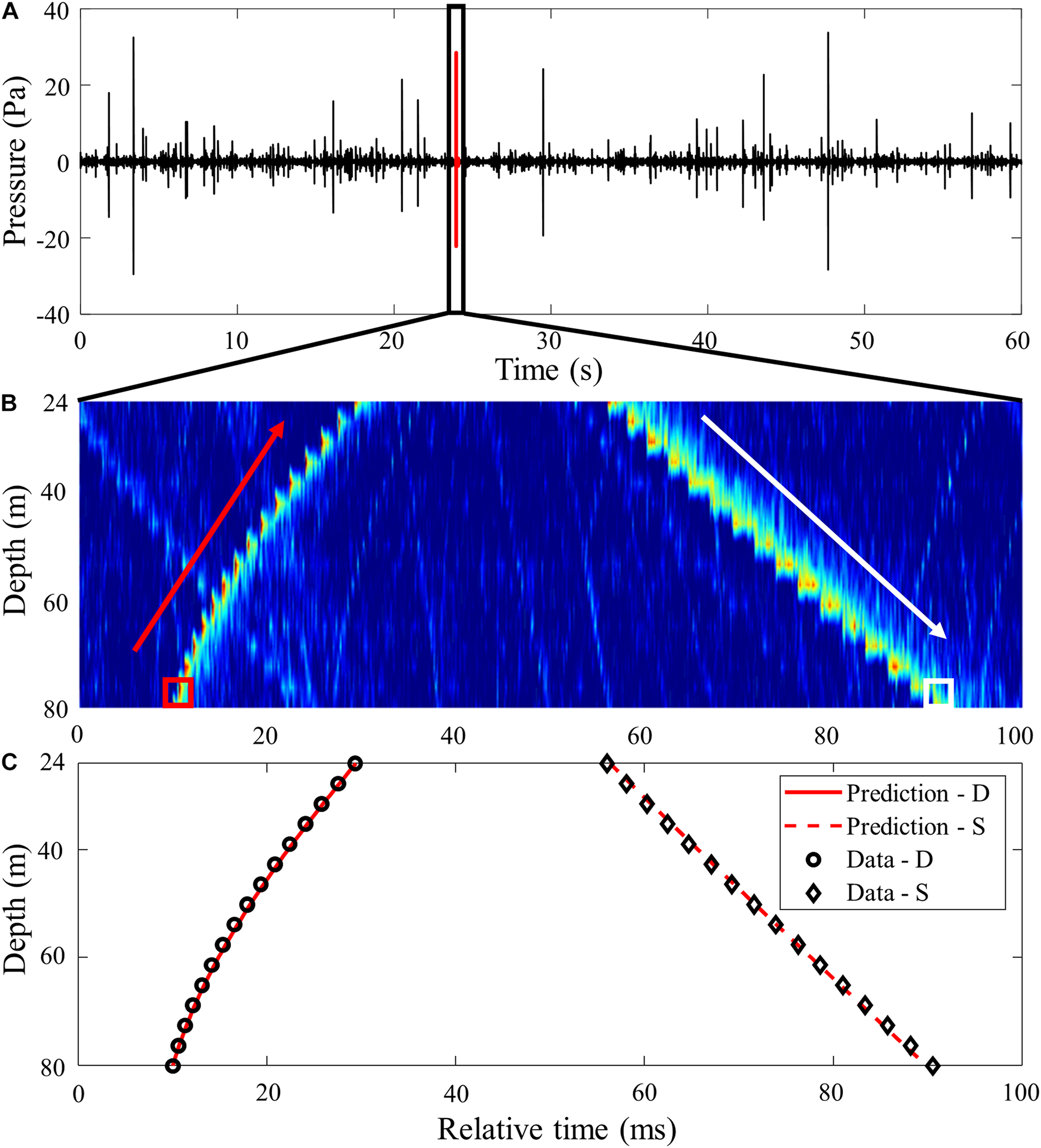 (A) Example of ambient noise data received for 1 min at the bottommost hydrophone (81 m) of VLA1 on JD 141 at 12:00 UTC, exhibiting many impulsive snapping shrimp noise. (B) Arrival structure of a single snapping shrimp noise in array depth and time over a 100-ms long time window, zoomed in on the black box in panel (A). The red arrow indicates that the snapping shrimp noise propagates spherically from the bottom to the sea surface, whereas the white arrow indicates a linear downward propagation of the sea surface-reflected snapping shrimp noise. (C) Model and data comparison for direct (D) and surface-reflected (S) arrival. The model assumes the source on the sea floor is at 75-m range from the array.