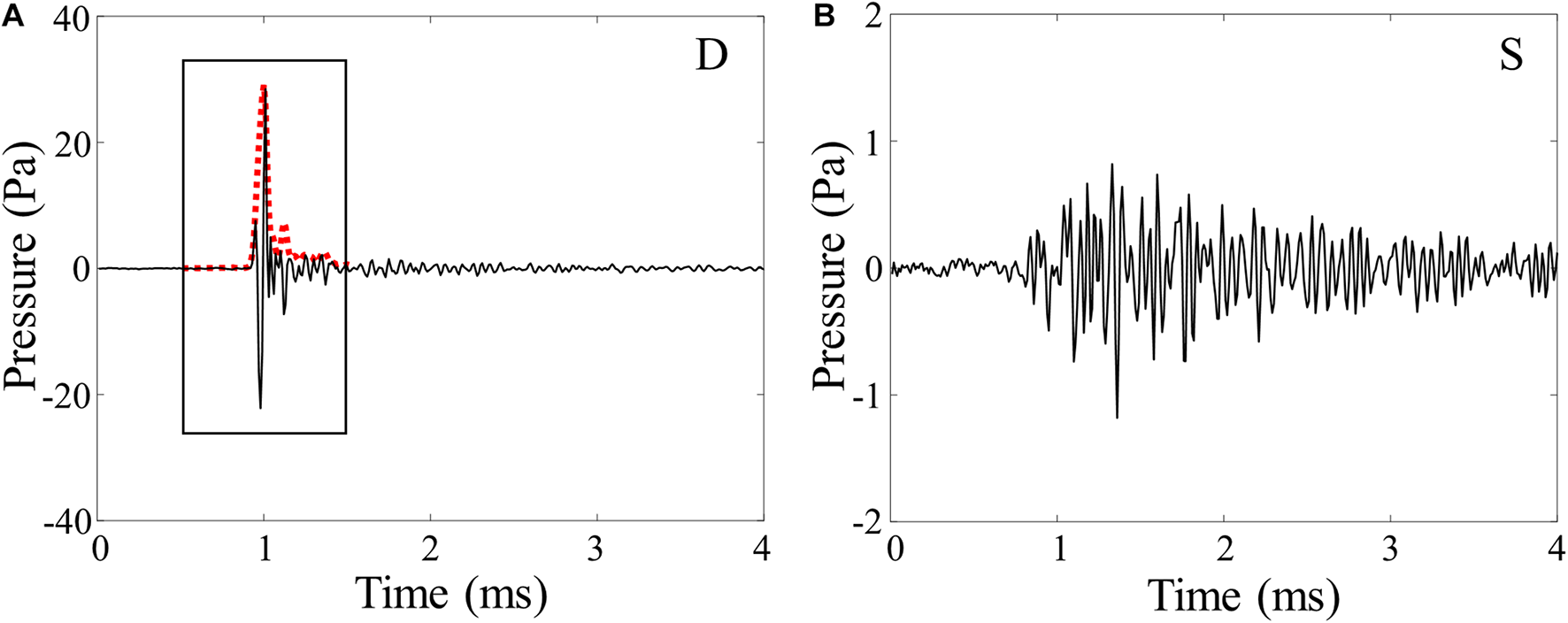 (A) Time series of the direct arrival (D) captured in the bottom red box in Figure 3B. The red dashed line indicates the 1-ms smoothed kernel envelope of the snapping shrimp noise. (B) The waveform of snapping shrimp noise reflected from the sea surface (S), captured in the bottom white box in Figure 3B. Note the different pressure scales.