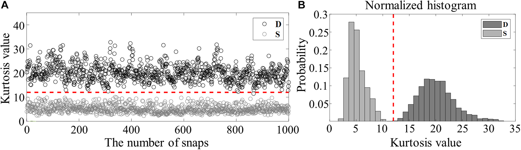 (A) Kurtosis values estimated from 1,000 waveforms for direct (D, black circles) and sea-surface reflected (S, gray circles) paths, which were collected by the bottom hydrophone of VLA1 for 30 min from JD 142 at 00:00 UTC. (B) Corresponding normalized histograms of kurtosis values for D (dark) and S (gray), respectively. The red vertical line denotes the kurtosis value of 11.2, which was selected as the criterion to filter out the S paths.