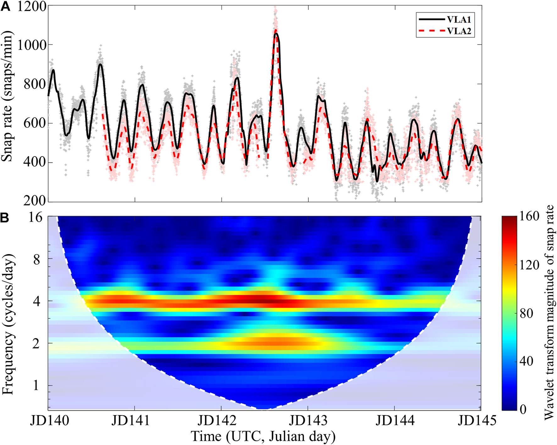 (A) Temporal variation of the snap rate extracted from the bottommost hydrophones of VLA1 (solid, gray dots) and VLA2 (dashed, pink dots) over a 5-day period (JD 140–JD 145). Each dot represents the snap rate calculated per minute, and a 90-point moving average produces the two smooth lines. Although the two arrays are separated by 5.5 km, the patterns are strikingly similar. (B) Magnitude scalogram of the snap rate at the VLA1 using the Morse wavelet method. The white dashed line marks the boundary of the cone of influence, and the shaded region below the line is affected by edge-effect artifacts. The scalogram highlights that the one-quarter-diurnal (four cycles per day) period is dominant in the snapping noise generated by the snapping shrimp inhabiting the SAVEX-15 area.