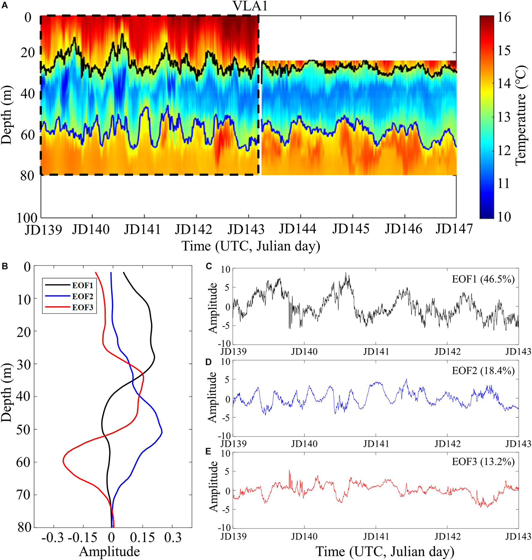 (A) Temporal variation of the temperature profile in the water column measured at VLA1 during the experiment. (B) Amplitude of the first three empirical orthogonal function (EOF) modes for the temperature profiles measured during the first 4 days marked by the dashed box in panel (A). (C–E) Temporal variations of the first three EOF modes.