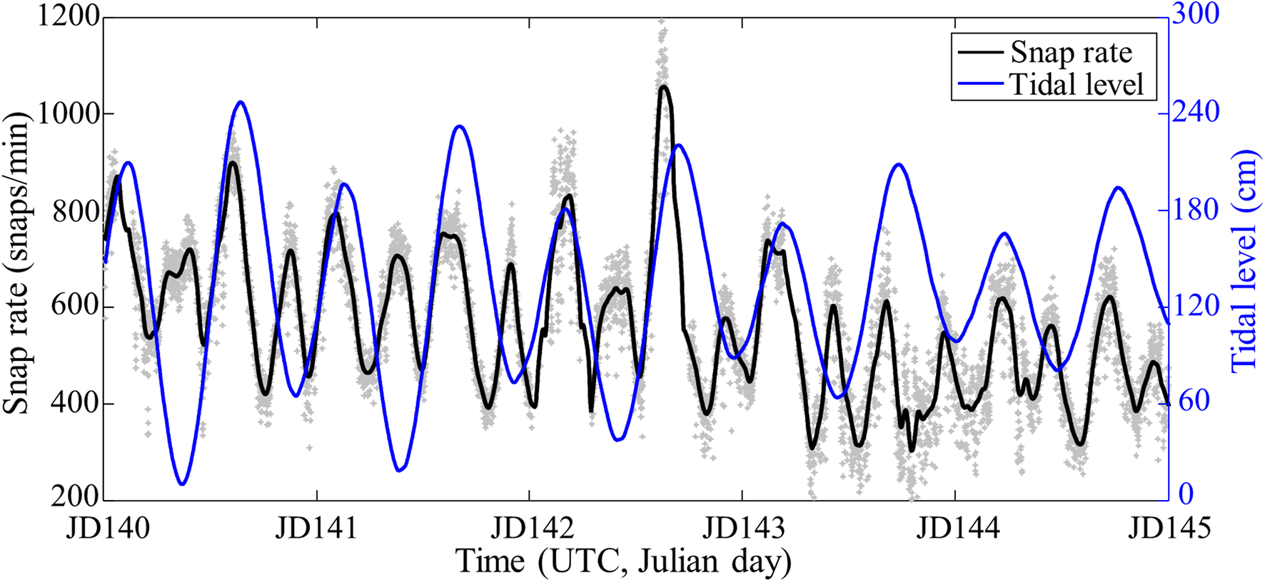The tidal variation can be deduced from the in situ tidal measurement at the nearby IEODO ocean research station (IORS) ∼100 km southwest of the SAVEX-15 area (Figure 1A) because the tidal phase difference between the two regions can be computed from the mean high-water intervals (MHWI) provided by the Korea Hydrographic and Oceanographic Agency (KHOA) website.2 For Korean waters, the MHWI is defined as the mean time lag between the transit of the moon over the meridian 135° east and the following high water at a given location. The tidal phase of our experimental site was estimated to be 4 min faster than that of IORS. In Figure 8, the extrapolated tide (blue line) from JD 140 to JD 145 indicates a strong semi-diurnal period in the region, in contrast with the one-quarter-diurnal cycle of the snap rate (Figure 6A). However, it appears that the snap rate tends to peak at both high and low tides with some time lag.