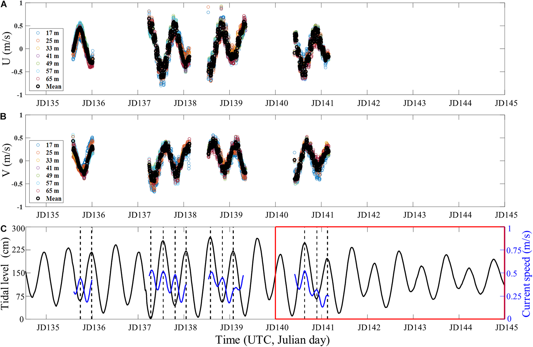 Time series of (A) zonal and (B) meridional components of the current velocity measured at various depths and their respective mean values (thick black circles). (C) The mean current speed (blue line) computed from panels (A,B) is superimposed on the tide (black line) at VLA1 site throughout the experiment (JD 135–JD 145). The vertical dashed lines denote the times of high and low tides. Our snap rate was estimated during the period in the red box (JD 140–JD 145).
