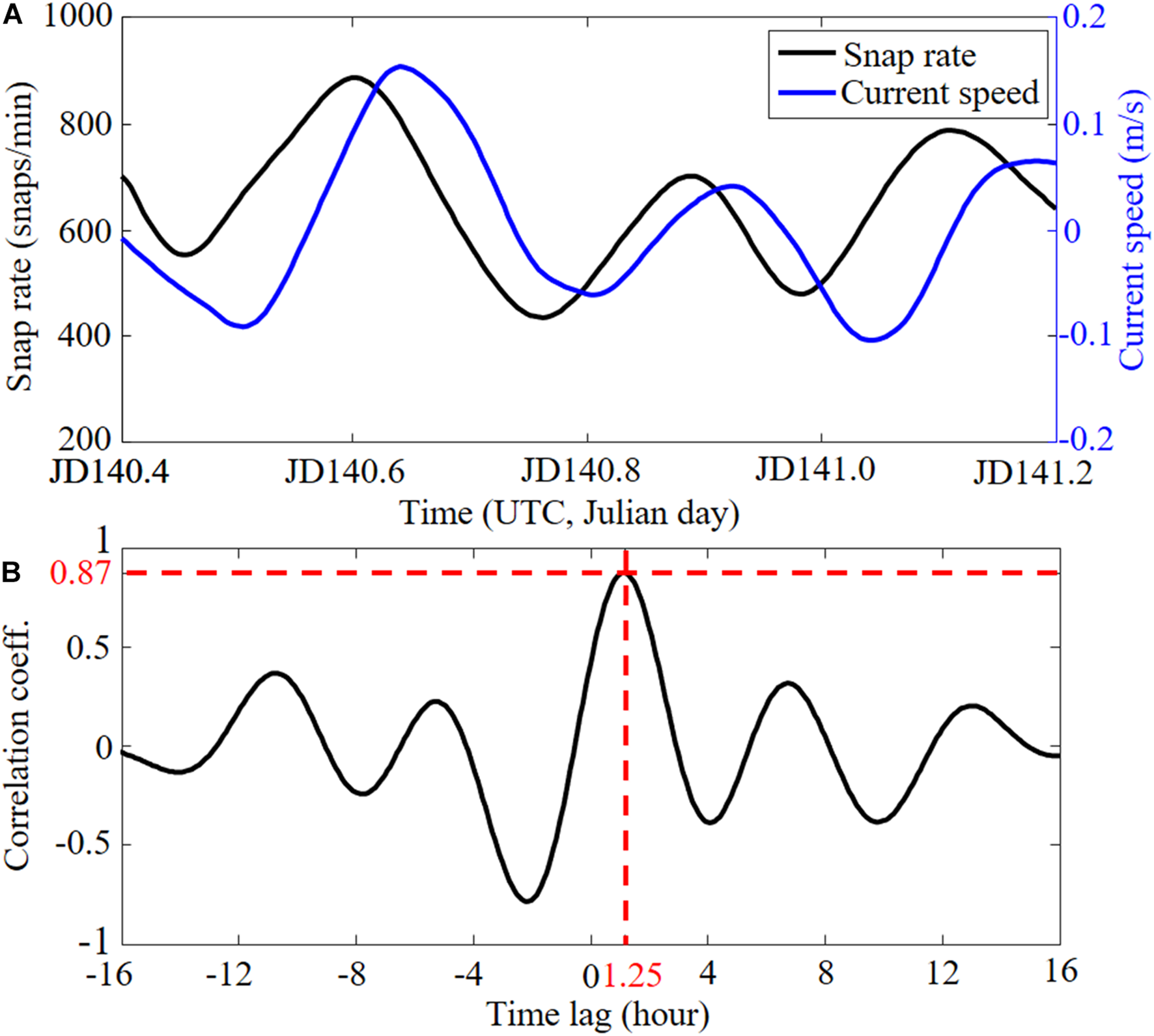 (A) Comparison between the snap rate (black) and current speed (blue) from JD 140.4 to JD 141.2 (see Figure 9C). (B) Cross-correlation between snap rate and current speed. The maximum correlation indicates that the snap rate peaks 1.25 h before the local maximum current.