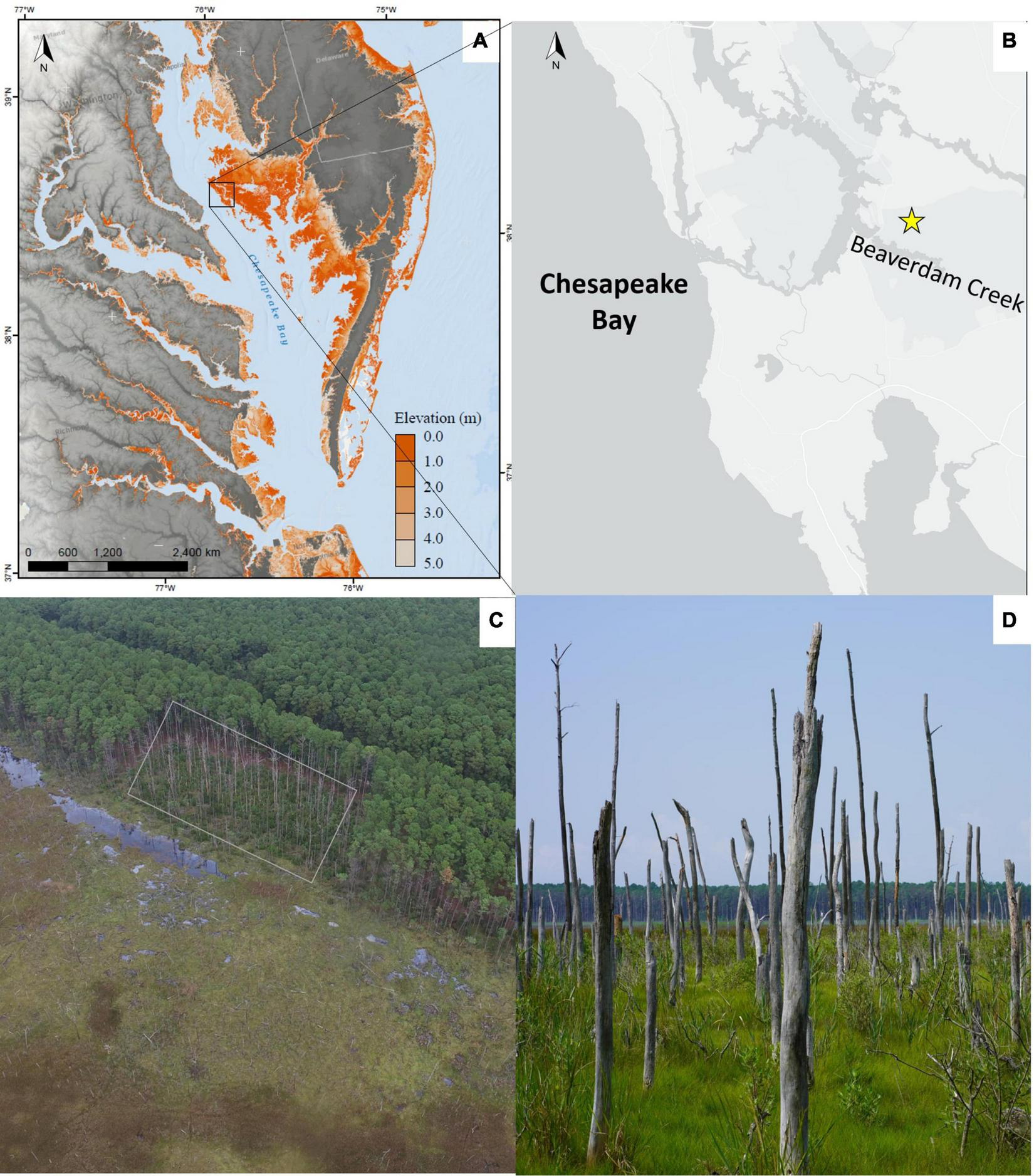 Figure 1. (A) Map of Chesapeake Bay region with an overlaid topobathymetric digital elevation model that displays elevation of areas <5.0 m NAVD88, from the United States Geological Survey’s Coastal National Elevation Database (Danielson and Tyler, 2016). Inset black box shows the position of the transgression experiment at the Blackwater National Wildlife Refuge on Maryland’s Eastern Shore of the Chesapeake Bay. (B) Site map showing Moneystump Swamp (yellow star) at the Blackwater National Wildlife Refuge situated on Beaverdam Creek, a tributary of the Chesapeake Bay, where the transgression experiment took place. (C) Aerial image of the Moneystump transgression experiment taken in 2018. The Control area is on the right side of the image where there are live trees, showing the natural gradient of pine forest transitioning to emergent brackish marsh. The overlayed rectangle shows the area where trees were killed via girdling (Credit: Tyler Messerschmidt). (D) Picture taken from within the ghost forest in the high marsh at Moneystump, looking parallel to the marsh forest boundary with the live forest to the right and the marsh extending out to the left. These trees are a sign of natural transgression that has occurred at this site (Credit: David C. Walters).