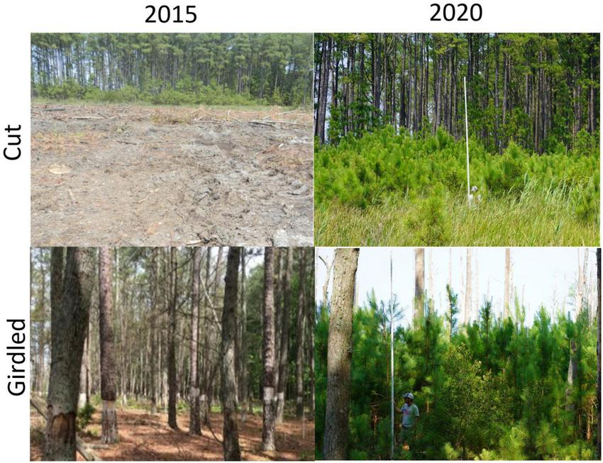 After the Cut and Girdled treatments were initiated in 2015, there were no live mature loblolly pines (P. taeda) remaining within the treatment areas (Figure 3, left). In the 5 years since, pine trees have largely recolonized the disturbed areas (Figure 3, right). Re-growing from seedlings, P. taeda has recovered to the point of once again being the dominant vegetation cover in the upland plots. P. taeda was never found above trace amounts in the low elevation plots (bins 4 and 5) where any seedling that did germinate died off shortly thereafter. Thus, the analysis of P. taeda growth and recovery focuses on the potential habitable range of the mid and high elevation plots (bins 1, 2, and 3).