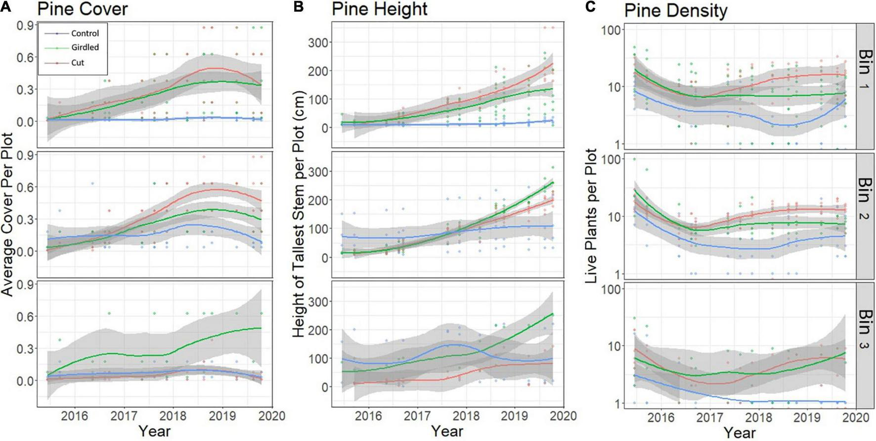 Figure 4. Multiple metrics to represent forest recovery (e.g., pine tree regrowth) at the Moneystump Swamp transgression experiment (Cambridge, MD, United States) over time for the high forest (bin 1), low forest (bin 2), and marsh forest transition (bin 3). (A) Change in cover class over time for understory P. taeda seedlings and saplings. (B) Change in height for tallest understory P. taeda in each plot. (C) Count of individuals in the understory, or density of P. taeda per 2 m2 plot. Each plot is color-coded for treatment, red is Cut, green is Girdled, and blue is Control. Trend lines depict Loess-smoothed local polynomial regression, with the shaded area around the trend lines showing the standard error.