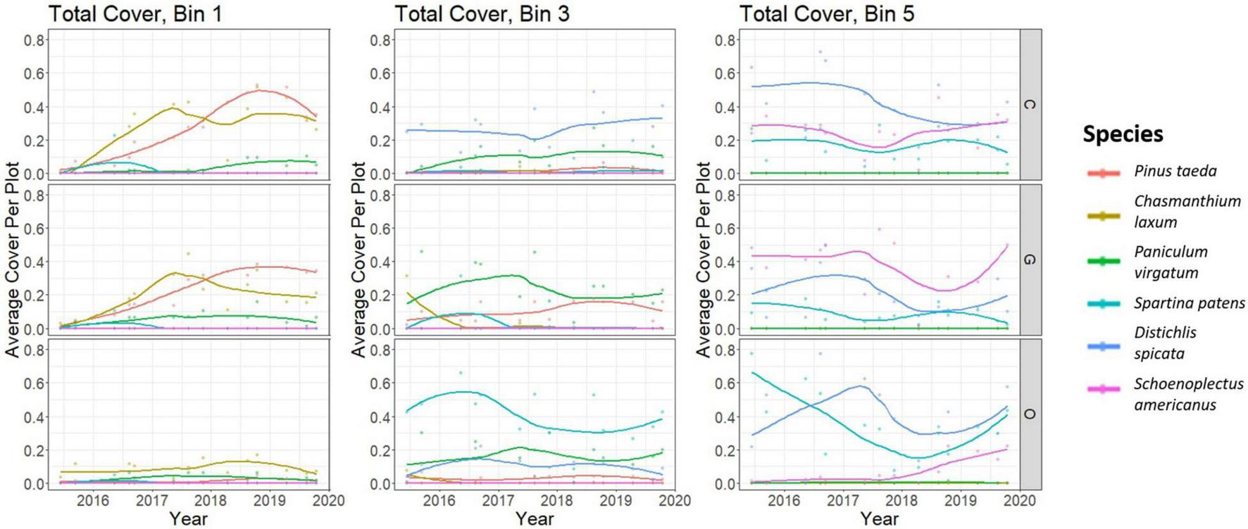 Figure 5. Plant cover over time for the six species with the highest total cover in the study area at Moneystump Swamp transgression experiment (Cambridge, MD, United States) over the course of the experiment (see legend), broken down by elevation bin (bin 1 on the left, bin 3 in the middle, and bin 5 on the right, showing only the high forest, transition, and low marsh, respectively, for simplicity) and treatment (Cut on top, Girdled in middle, and Control on bottom). A value of 1 represents complete coverage of all vegetation plots, and a value of zero represents complete absence from all vegetation plots. Trend lines depict Loess-smoothed local polynomial regression.