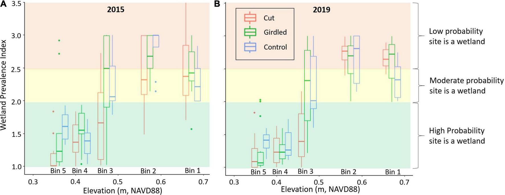 Figure 6. Wetland vegetation dynamics as a function of elevation and forest disturbance with Prevalence Index (PI) for the occurrence of hydrophytic vegetation versus elevation, color-coded by treatment area for (A) the first year of the experiment (2015) and (B) the last year (2019). PI values greater than 2.5 indicate a low probability a site is a wetland, values between 2 and 2.5 indicate a good probability that a site is a wetland, and values less than 2 indicate a high probability that a site is a wetland. Boxplot centerline represents the median value of the data, the upper and lower box sides represent the 25th and 75th percentile datapoints, the whiskers extend to the largest and smallest values within the 1.5 interquartile range of the 25th and 75th percentile, and all remaining points are plotted as outliers.