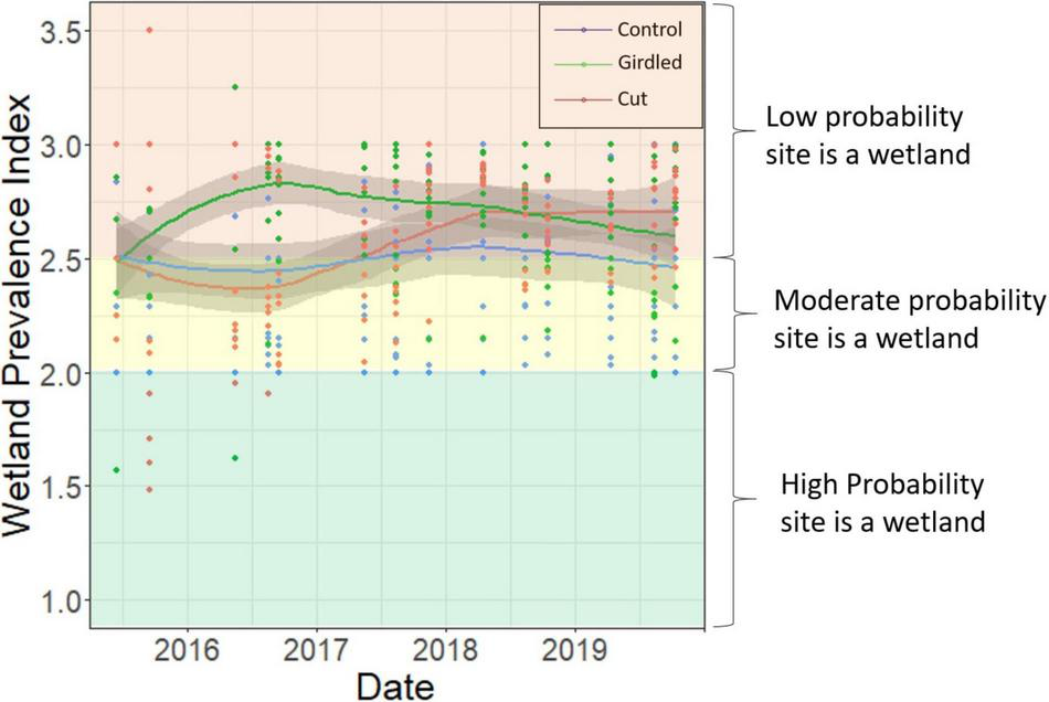Figure 7. Change in Wetland Prevalence Index (PI) over time in upland elevation bins 1 and 2, color-coded by treatment. PI values greater than 2.5 indicate a low probability a site is a wetland, values between 2 and 2.5 indicate a good probability that a site is a wetland, and values less than 2 indicate a high probability that a site is a wetland. Points represent the PI calculated from each vegetation survey conducted for each single vegetation plot in upland bins 1 and 2. Trend lines depict Loess-smoothed local polynomial regression, with the shaded area around the trend lines showing the standard error.