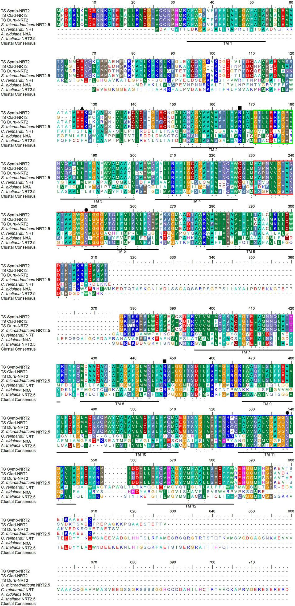 Molecular characterization of the deduced amino acid sequences of nitrate transporter 2 from Symbiodinium (Symb-NRT2), Cladocopium (Clad-NRT2), and Durusdinium (Duru-NRT2) obtained from the outer mantle of Tridacna squamosa. Multiple alignment of Symb-NRT2 (MZ014639), Clad-NRT2 (MZ014640), and Duru-NRT2 (MZ014641) with Symbiodinium microadriaticum NRT2.5 (OLQ11495.1), Chlamydomonas reinhardtii NRT (XP_001694496.1), Aspergillus nidulans NrtA (AAA76713.1), and Arabidopsis thaliana NRT2.5 (NP_172754.1). Shaded residues indicate identical or similar amino acid residues. Asterisks denote identical amino acid residues, colons denote strongly similar amino acids, and periods denote weakly similar amino acids. The twelve predicted transmembrane regions (TM 1–TM 12) underlined in black were predicted using TMpred provided by ExPASy Bioinformatics Resource portal. Black boxes denote substrate-binding residues. Hydrophobic residues and polar residues that make up the gate at the substrate binding site are indicated with black triangles and black circles, respectively. The two nitrate signature regions, NS1 and NS2, are marked with red and blue boxes, respectively: [FYK]-X3-[ILQRK]-X-[GA]-X-[VASK]-X-[GASN]-[LIVFQ]-X1,2-G-X-G-[NIM]-X-G-[GVTA].