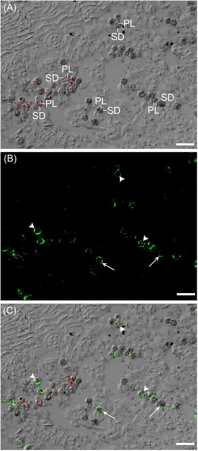 Immunolabeling of zooxanthellae-nitrate transporter 2 (Zoox-NRT2), which comprised NRT2 of Symbiodinium, Cladocopium and Durusdinium, in the outer mantle of Tridacna squamosa. (A) The differential interference contrast (DIC) image is overlaid with the red channel showing autofluorescence of the plastids (PL) of symbiotic dinoflagellates (SD). (B) The green channel showing green immunofluorescence of Zoox-NRT2 labeled with the anti-Zoox-NRT2 antibody. (C) The DIC image overlaid with the red channel and green channel. Arrows indicate Zoox-NRT2 immunolabeling (green) of the plasma membrane of SD. Arrowheads indicate Zoox-NRT2 immunolabeling (green) of intracellular vesicles in SD. Scale bar: 20 μm. Replicable results were obtained from three individuals of T. squamosa.