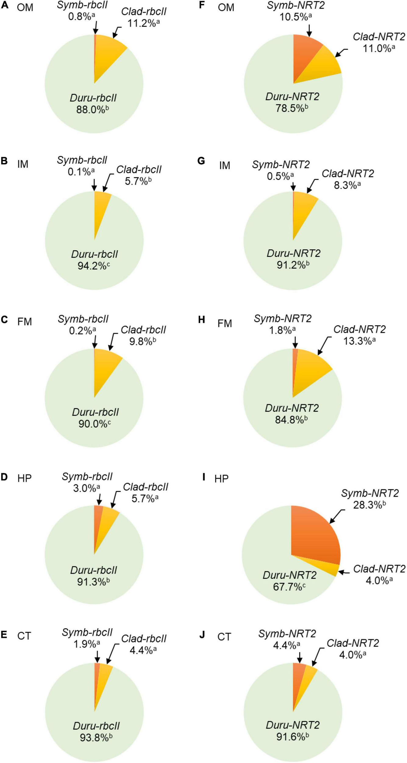 Proportion of transcript levels of form II ribulose-1,5-bisphosphate carboxylase/oxygenase (rbcII) or transcript levels of nitrate transporter 2 (NRT2) derived from Symbiodinium (Symb-rbcII and Symb-NRT2, respectively), Cladocopium (Clad-rbcII and Clad-NRT2, respectively) and Durusdinium (Duru-rbcII and Duru-NRT2, respectively) in five organs of Tridacna squamosa. Results (n = 13) are expressed as mean percentages in (A,F) the outer mantle (OM), (B,G) the inner mantle (IM), (C,H) the foot muscle (FM), (D,I) the hepatopancreas (HP), and (E,J) the ctenidium (CT). Means that are significantly different from each other are labeled with different letters (p-value < 0.017 after Bonferroni adjustment).