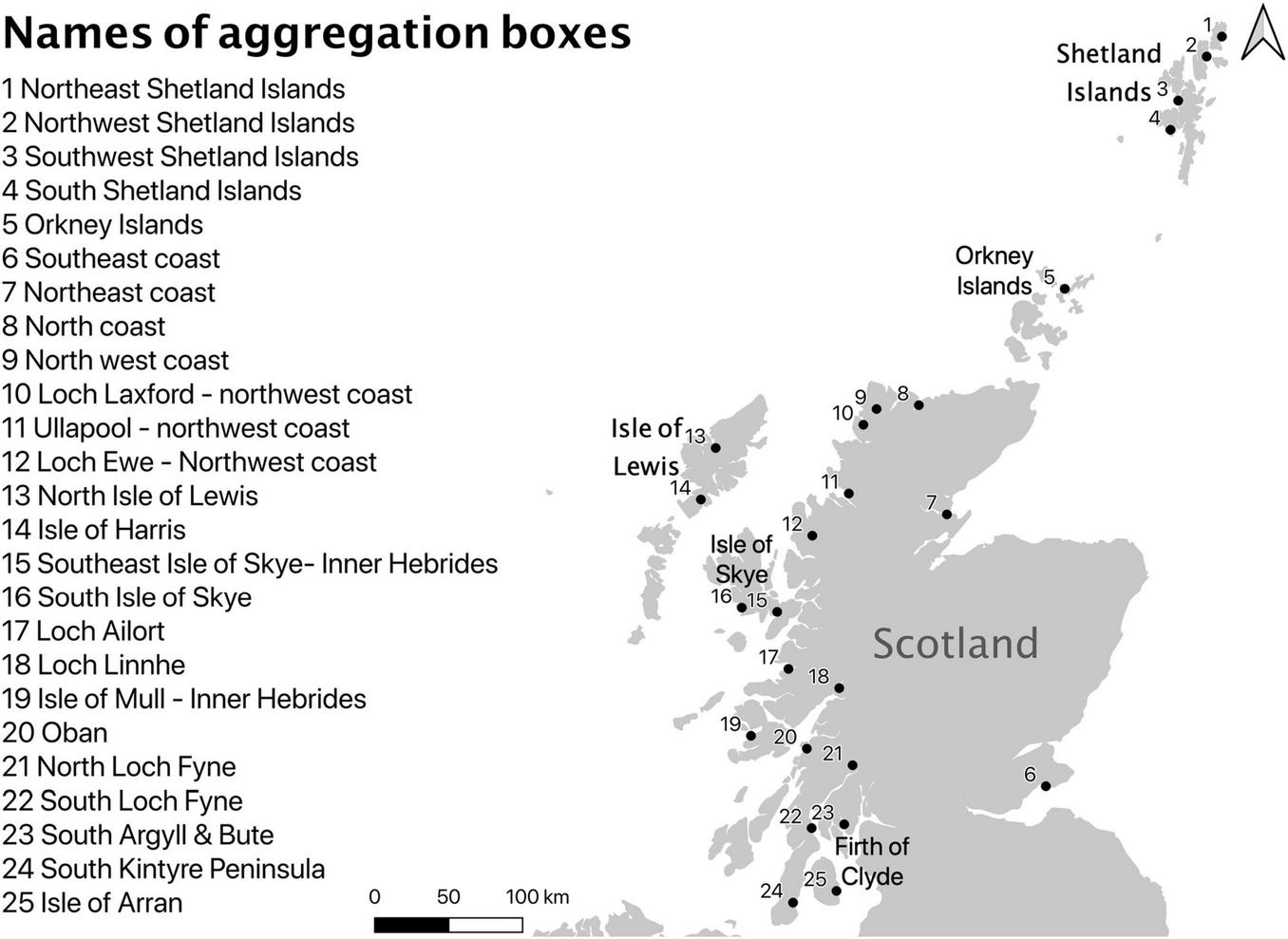 Names and location of the 25 aggregation boxes used (Geographical order North to South).