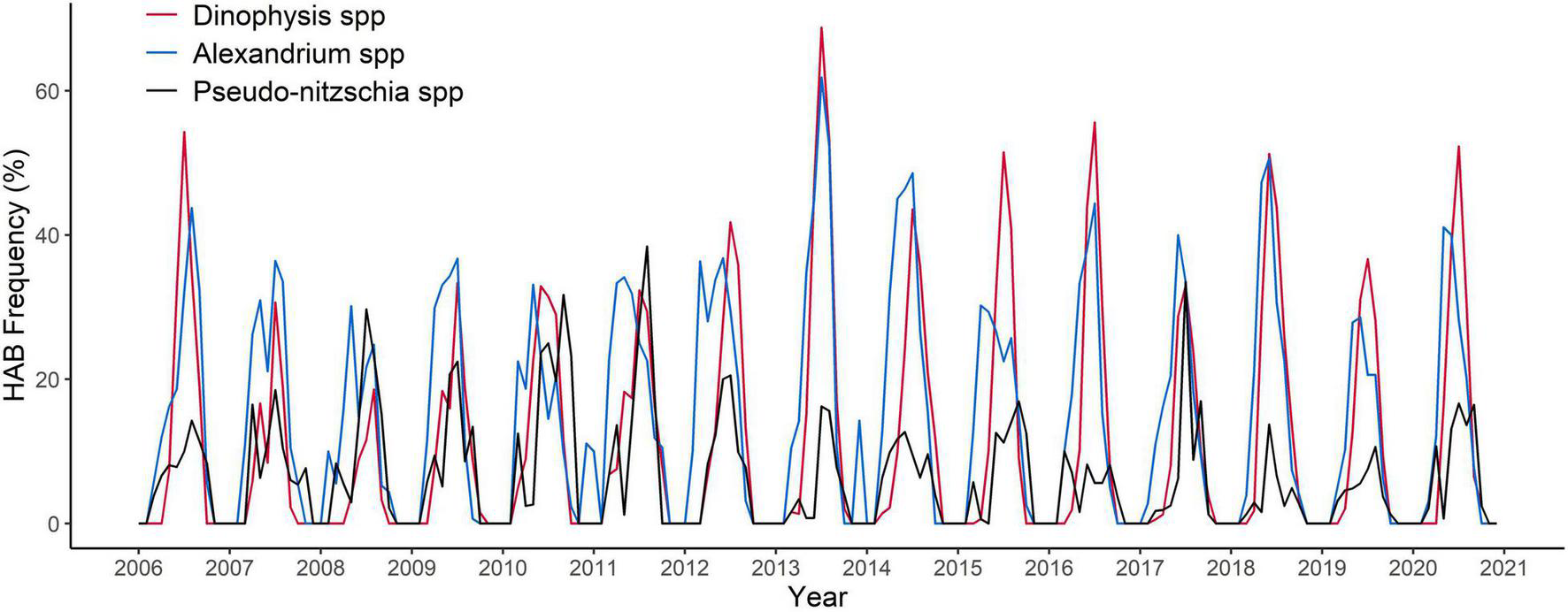 Time series of the proportional frequency of monthly HAB events for genera: Dinophysis spp. DSTs -related (red line), Alexandrium spp. PSTs-related (blue line), Pseudo-nitzschia spp. DA -related (black line) from 2006 to 2020 in Scotland. Total number of samples 16,987.