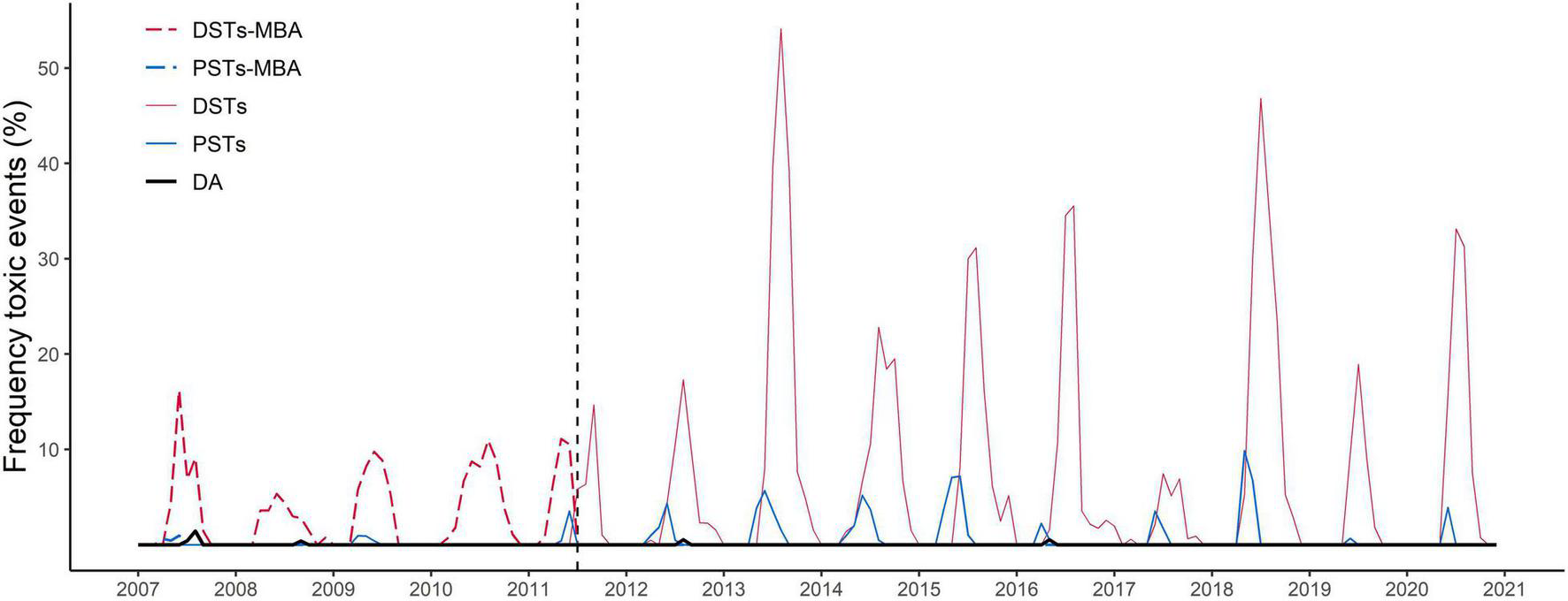 Time series of the proportional frequency of biotoxin monthly events above safety limits from 2007 to 2020 in Scotland, for DSTs-MBA (dashed red line), PSTs-MBA (dashed blue line) (biological assay); DSTs (red line), PSTs (blue line), and DA (black line) (using instrumental method). Vertical dotted line in July 2011 marks the start of the use of the LC-MS/MS method for DSTs quantification in mussels. In previous years, MBA were mainly used. See Table 1 for definition of abbreviations. Total number of tests performed 58,808.