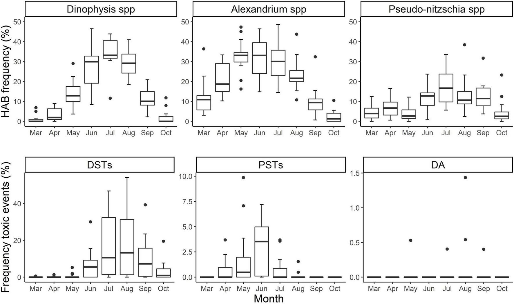 Boxplots of the monthly incidence of HAB taxa: Dinophysis spp., Alexandrium spp., Pseudo-nitzschia spp., and HAB toxins: DSTs, PSTs, DA. Boxplots display the median (bold horizontal line), upper and lower quartile (hinge), maximum and minimum range (whiskers) and outliers (dots above whiskers) of the yearly average of events by month.