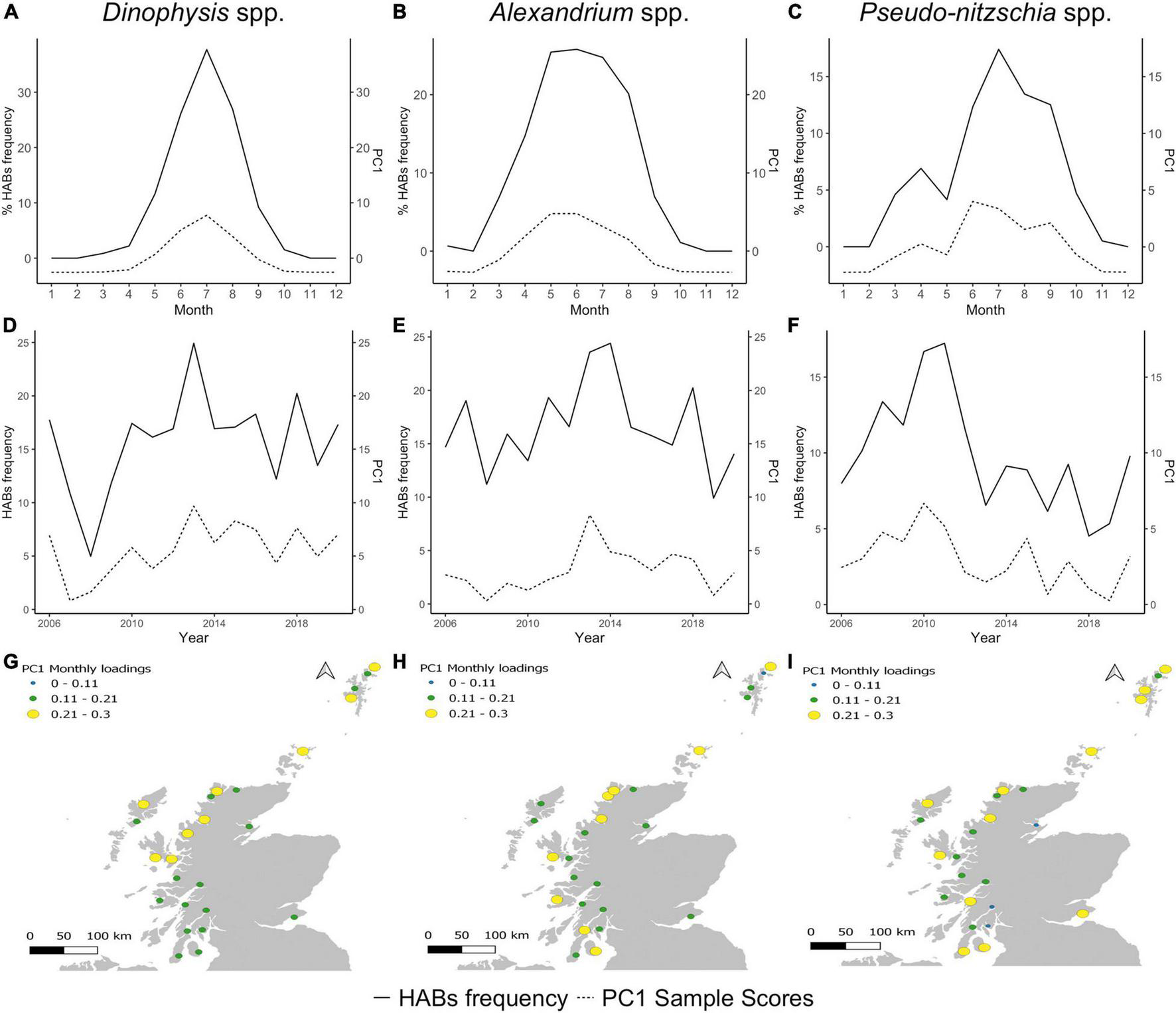 First principal component (PC1) of Dinophysis spp., Alexandrium spp. and Pseudo-nitzschia spp. (A–C) Monthly sample scores, (D–F) annual sample scores, (G–I) monthly factor loadings per aggregation box.