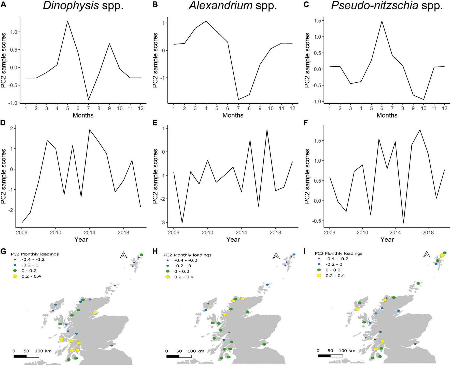 Second principal component (PC2) of Dinophysis spp., Alexandrium spp., and Pseudo-nitzschia spp. (A–C) Monthly sample scores. (D–F) Annual sample scores. (G–I) Monthly factor loadings per aggregation box.