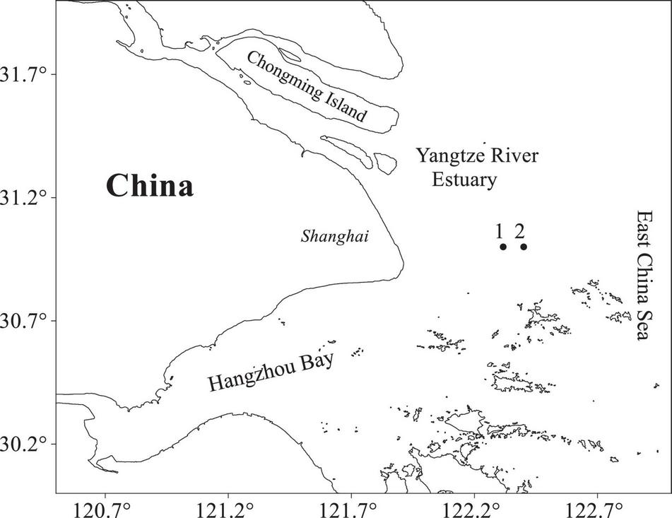 Locations of sampling sites in the Yangtze River Estuary region. Numbers 1 and 2 are sampling locations.