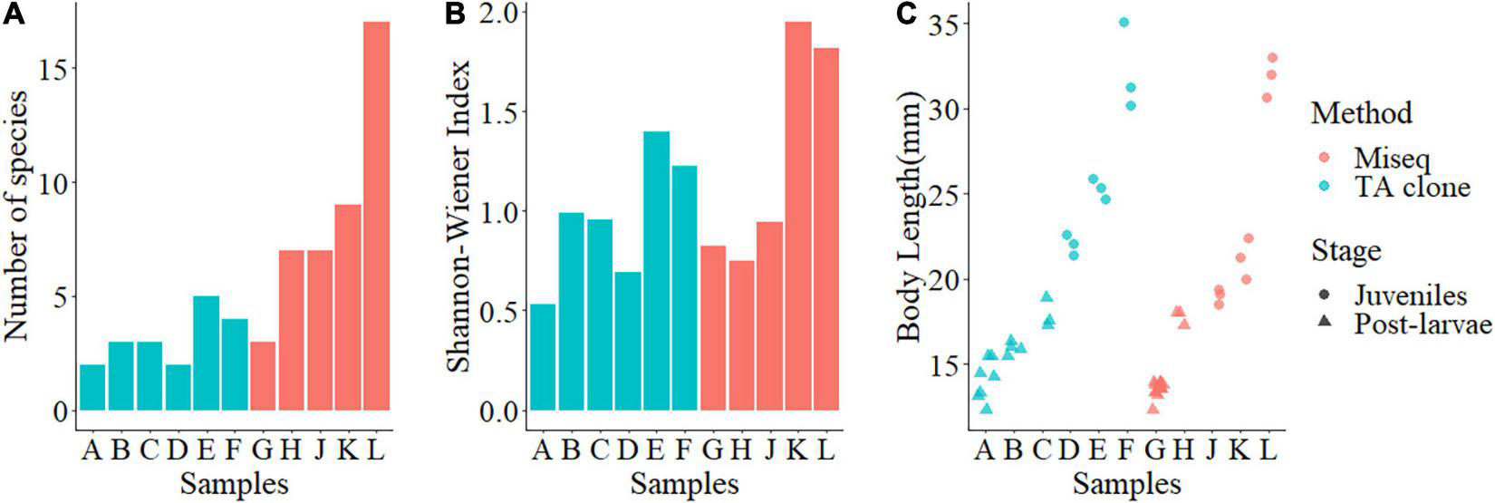 Prey species richness, prey diversity, and body length of post-larval and juvenile small yellow croakers (Larimichthys polyactis). (A) Prey species richness; (B) Prey diversity; (C) Body length. Red indicates samples analyzed using MiSeq, and blue indicates samples analyzed using TA cloning. In panels (A,B), bars A, B, C, G, and H show post-larva, and bars D, E, F, J, K, and L show juveniles. In panel (C), triangles represent post-larva, and dots represent juveniles.
