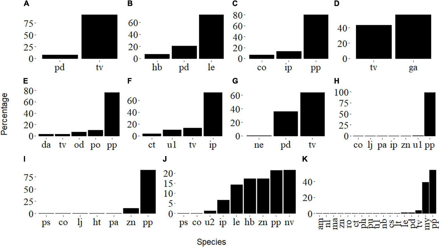 Percentage of prey amplicons for post-larval (i.e., (A–C,G,H)) and juvenile (i.e., (D–F,I–K)) L. polyactis. See Table 2 for the species abbreviations.