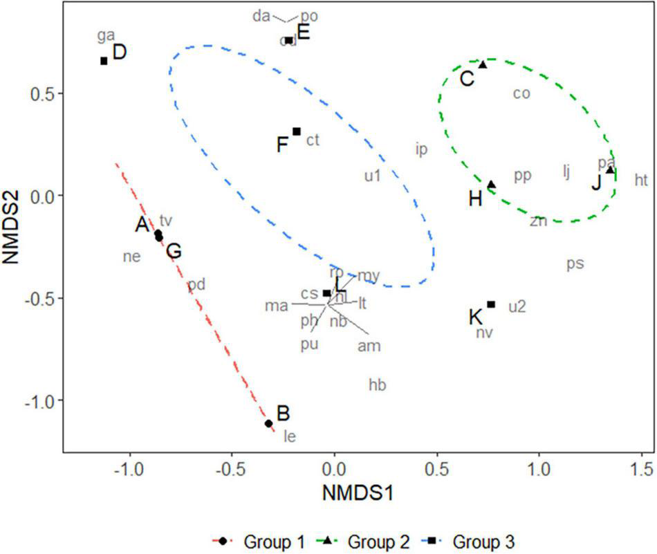 Non-metric Multidimensional Scaling (NMDS) of prey animals of larval and juvenile L. polyactis. Stress = 0.09, and confidence limit for the ordination ellipse is 90%. Analysis of similarity (ANOSIM) on three groups: R = 0.34, P < 0.05. Group 1 represents animals with an average body length <17 mm (post-larva); Group 2 represents animals between 17 and 19 mm (post-larva or juvenile at the transitional stage); Group 3 represents animals >20 mm (juvenile).