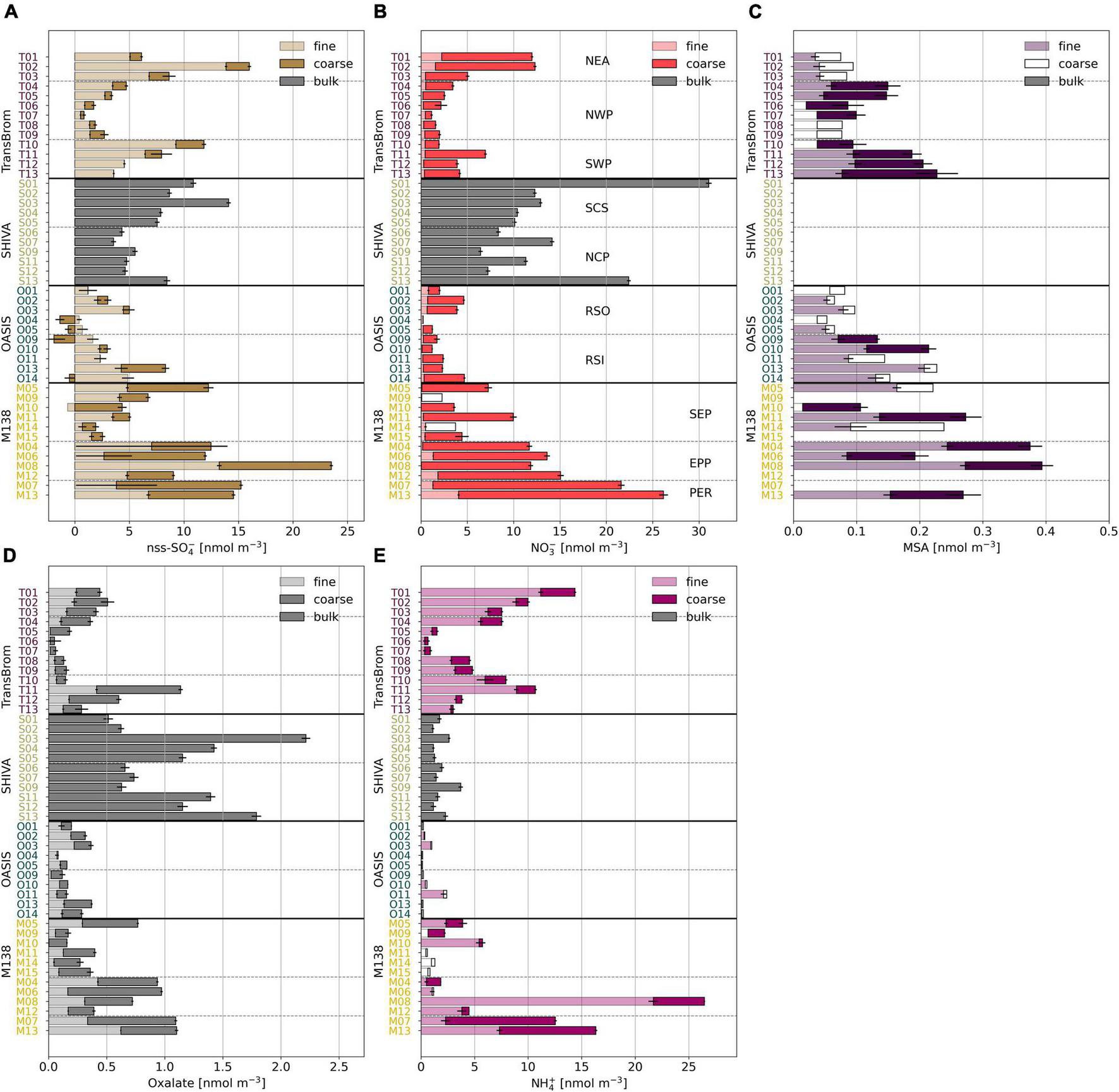 Bar plots of (A) nss-SO42–, (B) NO3–, (C) MSA, (D) oxalate, and (E) NH4+ in fine (light), coarse (dark), and bulk (grey) mode aerosol fractions for all samples of TransBrom (T01-T13), SHIVA (S01-S13), OASIS (O01-O14), and M138 (M04-M15). MSA was not measured in the SHIVA samples. Empty bars indicate concentrations below the detection limit. Nss-concentrations for which the error is larger than the parameter itself are omitted. Note that for M138 the sample order has been changed to allow the SEP, EPP, and PER air masses to be grouped together.