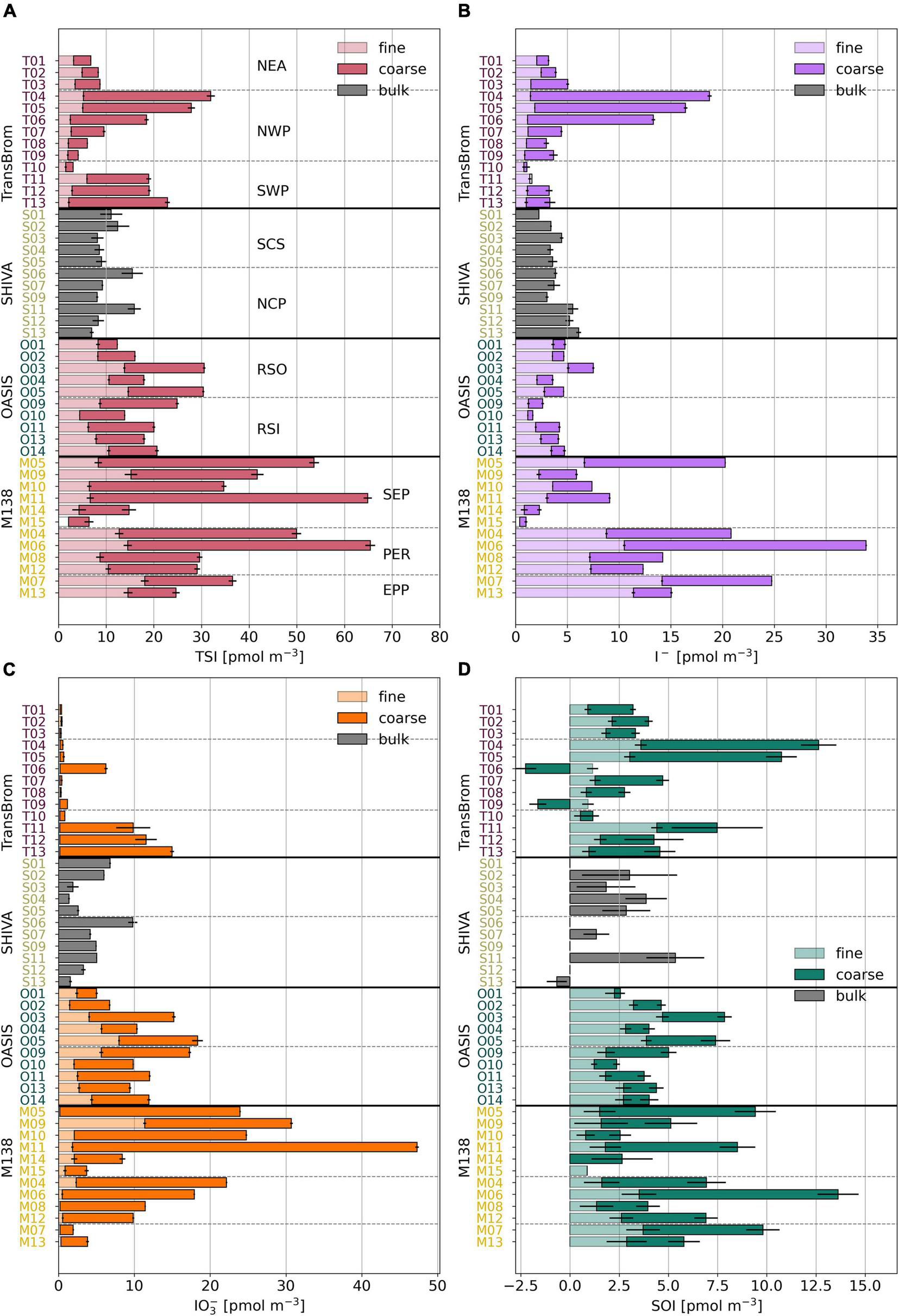 Bar plots of TSI (A), I–(B), IO3–(C), and SOI (D) concentrations in fine (light), coarse (dark), and bulk (grey) mode for TransBrom, OASIS, M138, and SHIVA aerosol samples. Empty bars indicate concentrations below the detection limit. SOI concentrations for which the error is larger than the parameter itself are omitted. Details are as for Figure 3.