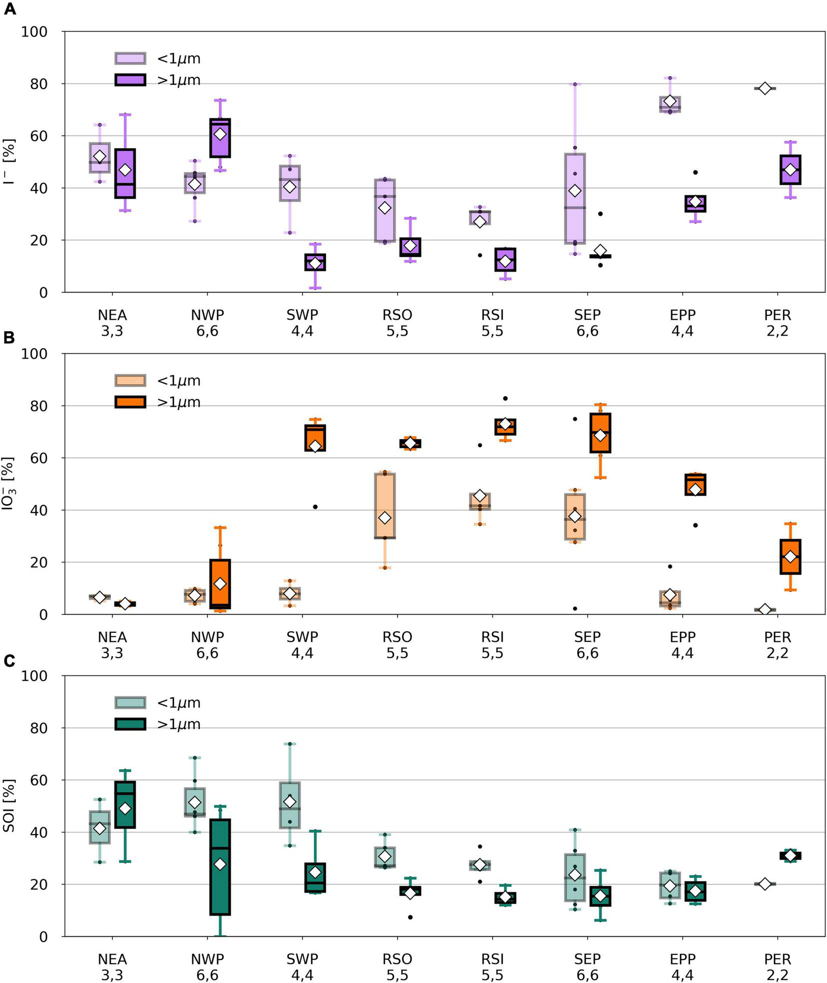 The chemical composition of aerosols drives aqueous and heterogeneous reactions that are important to the iodine chemistry and speciation. Coarse mode aerosols (>1 μm) in the datasets presented here are dominated by sea salt aerosols, formed through primary aerosol production mechanisms, such as sea spray and bubble bursting (Smith et al., 1993). The nss-Ca2+ concentrations in the samples reported here were extremely low, i.e., 1–2 orders of magnitude lower than reported for aerosols containing Saharan dust over the Atlantic Ocean (Baker and Yodle, 2021a). Mineral dust therefore appears to be a minor component of the TransBrom, SHIVA, OASIS, and M138 aerosols. Secondary aerosol production mechanisms, such as the oxidation and subsequent condensation of gases, are often associated with fine mode aerosol particles (<1 μm; Blanchard and Woodcock, 1980). Ions such as nss-SO42–, oxalate, and MSA are indeed predominantly found in the fine mode aerosol samples (Figure 3). NO3– has its highest concentrations in the coarse mode fractions, which is a result of nitric acid displacing Cl– within sea salt aerosols (Robbins et al., 1959; Mamane and Gottlieb, 1992; Andreae and Crutzen, 1997).