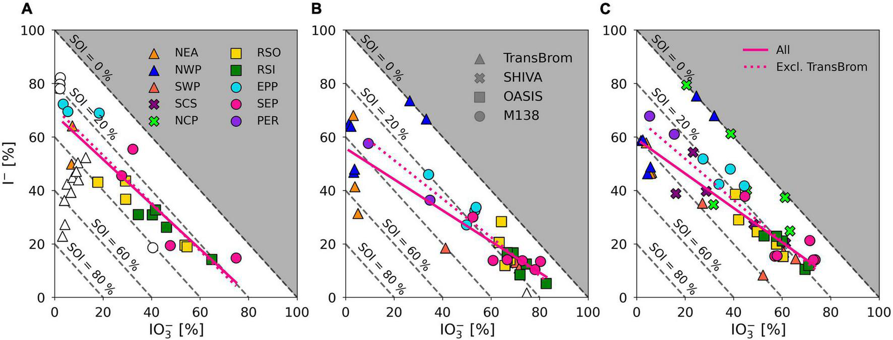 The proportions of IO3–, I–, and SOI are variable within and between air mass types. Conspicuous among all samples are the low or undetectable IO3– concentrations for many of the TransBrom aerosols (West Pacific Ocean). Exceptions are the coarse mode samples T06 and T11-T13 (the three southern-most samples), which have IO3– concentrations > 9.7 pmol m–3 (Figure 4). I– and SOI are the dominant species in NEA and NWP samples, both accounting for around 50% of TSI. The coarse mode of samples T11-T13 are the only three TransBrom samples for which IO3– is the dominant species.